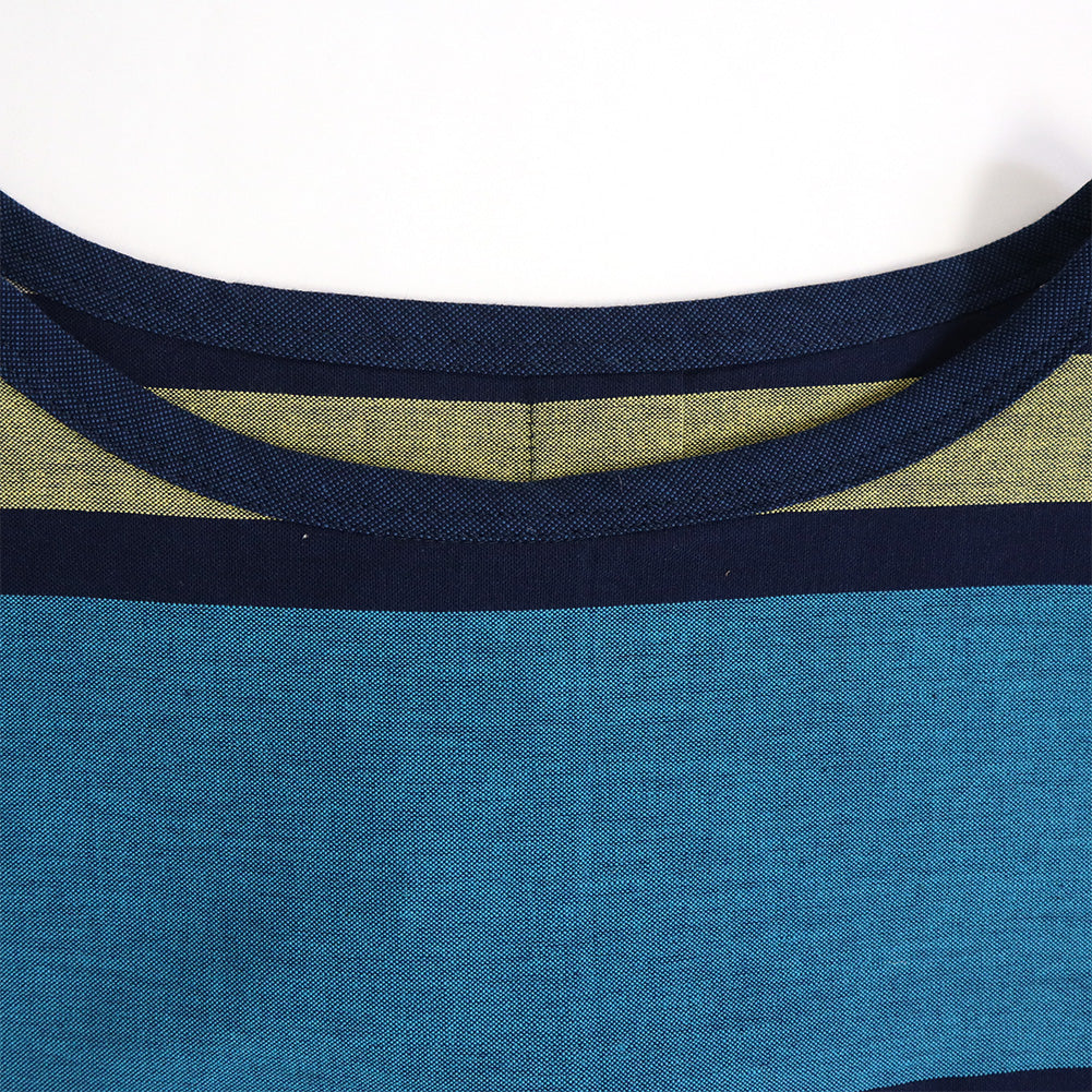 - A tunic-length dress with stripes in a bold color scheme turned vertically and horizontally.