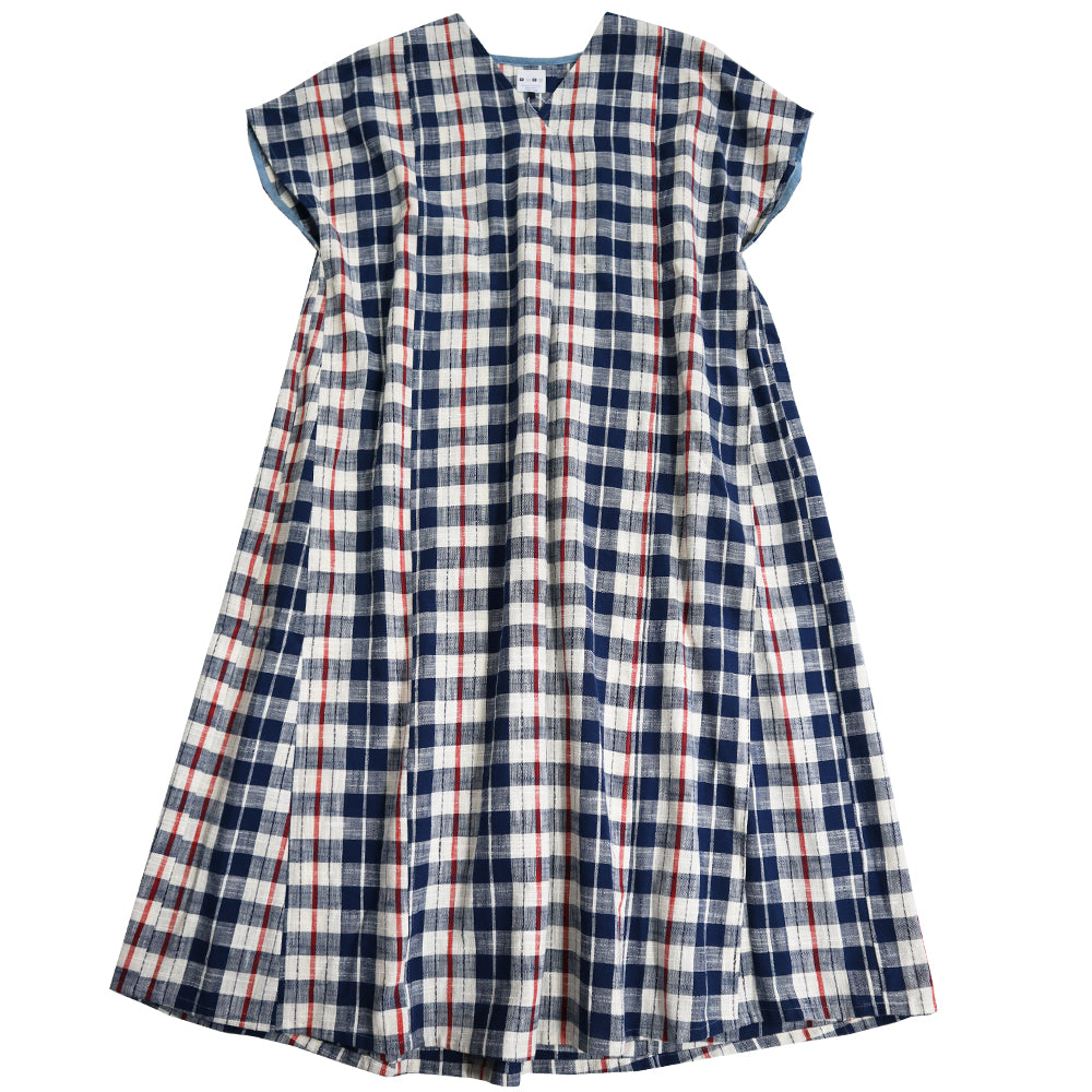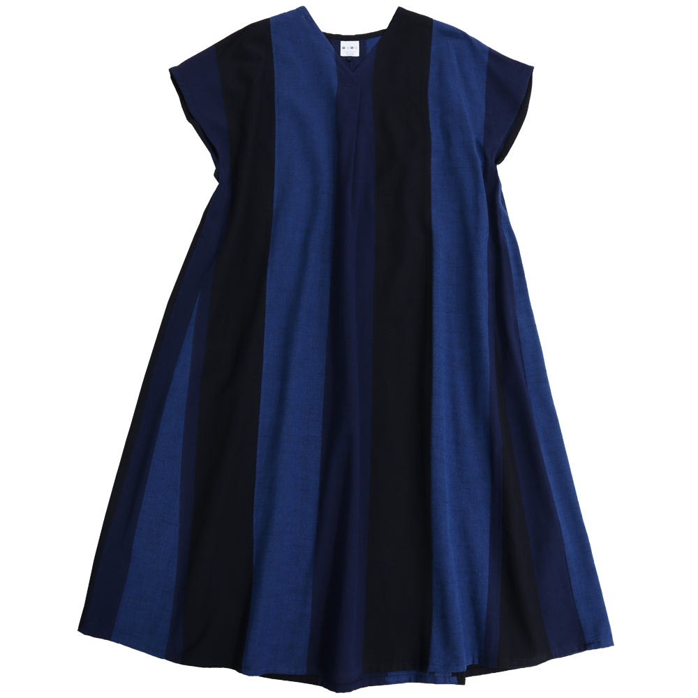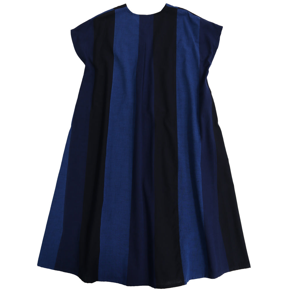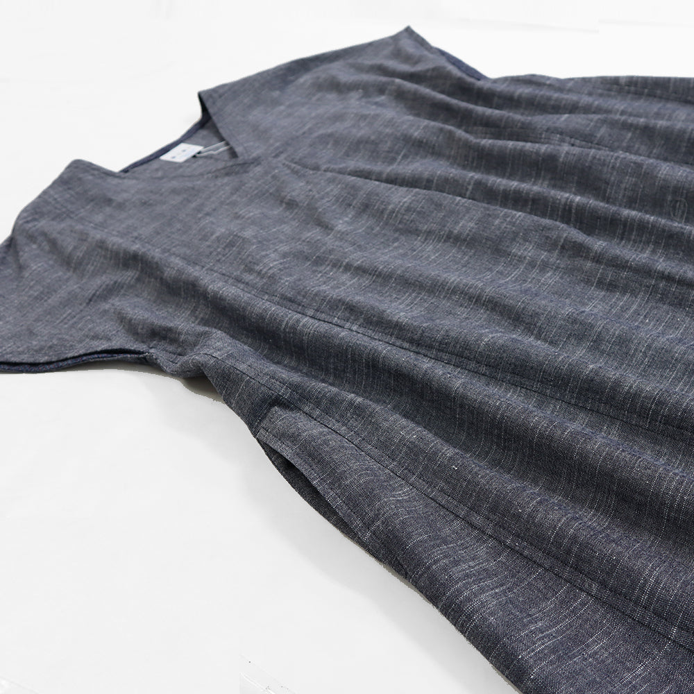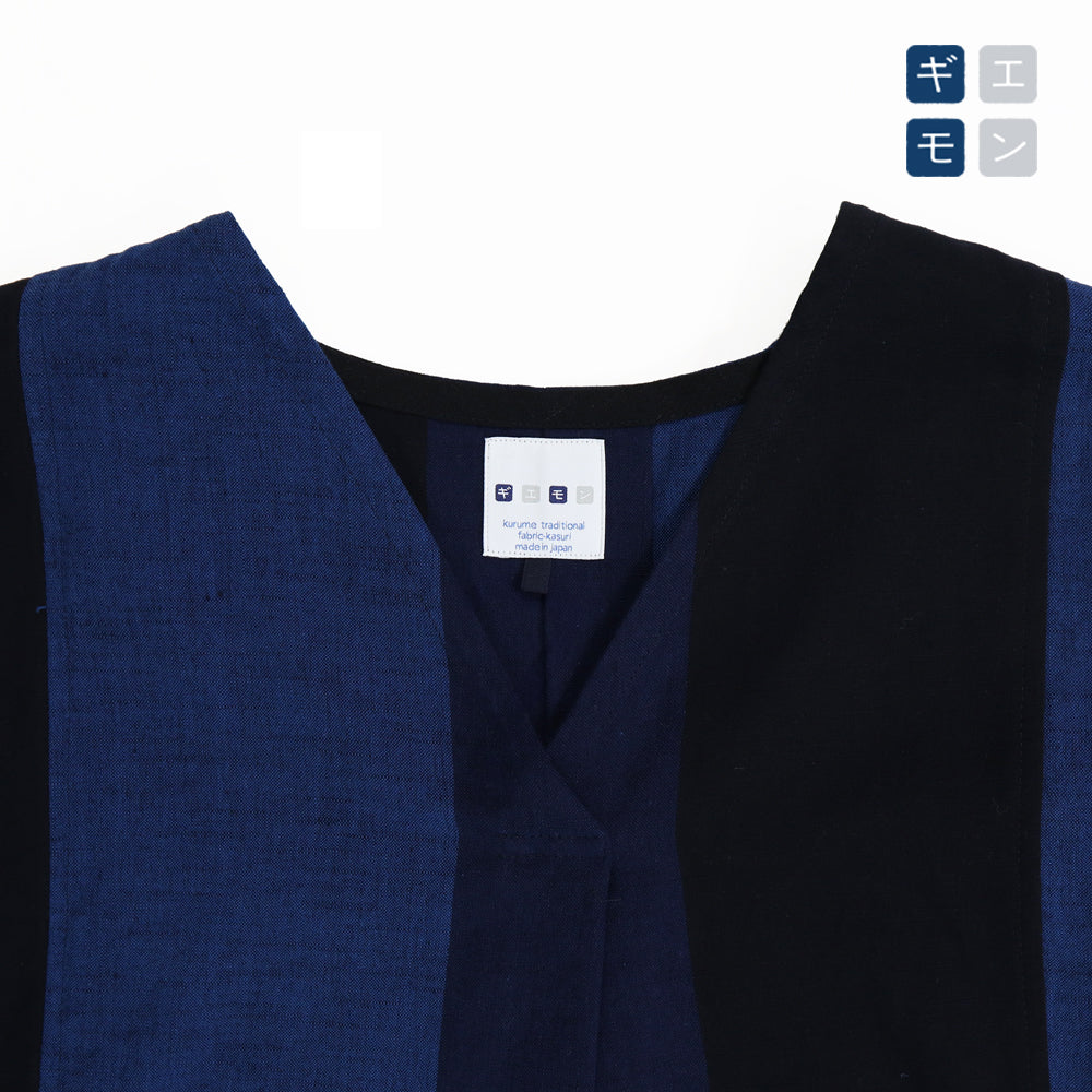 A sleeveless dress made from generously voluminous Kurume kasuri fabric.