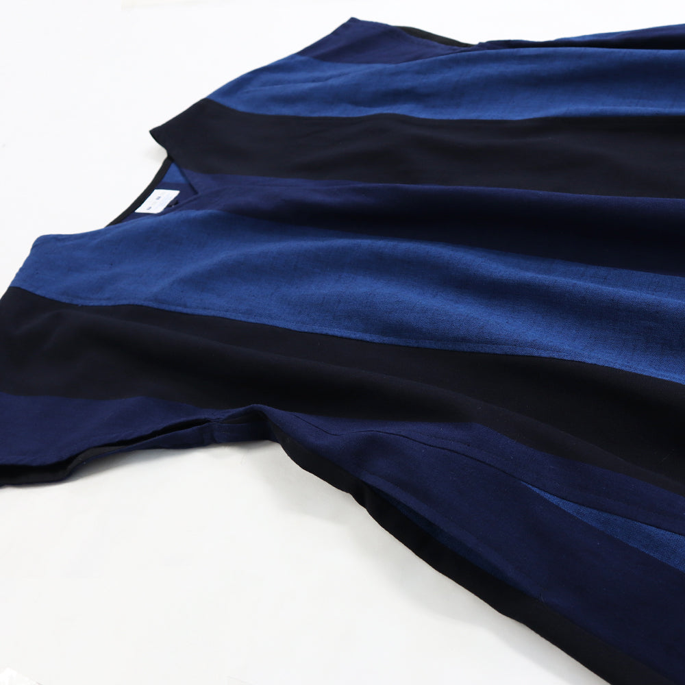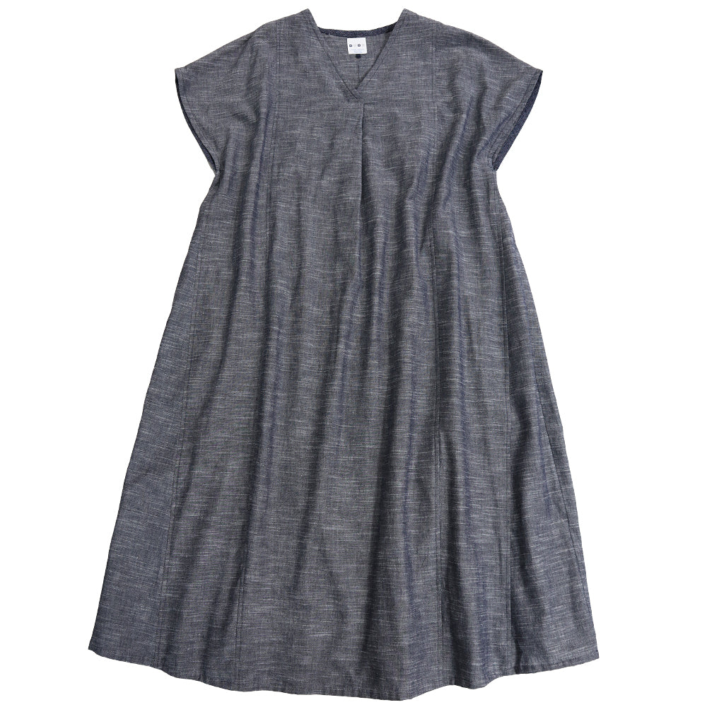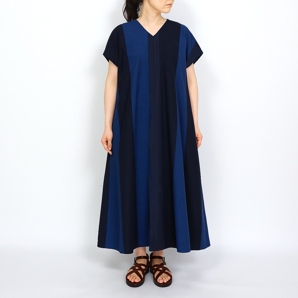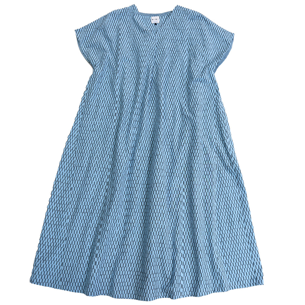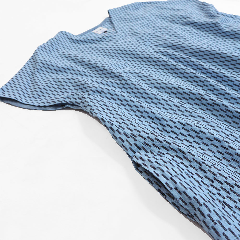A sleeveless dress made from generously voluminous Kurume kasuri fabric.