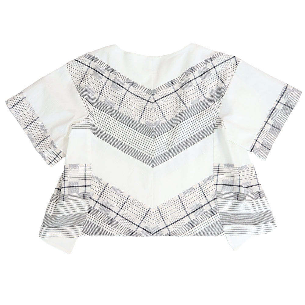 A pullover blouse with a color scheme that alternates between checks, stripes, and solid colors.
