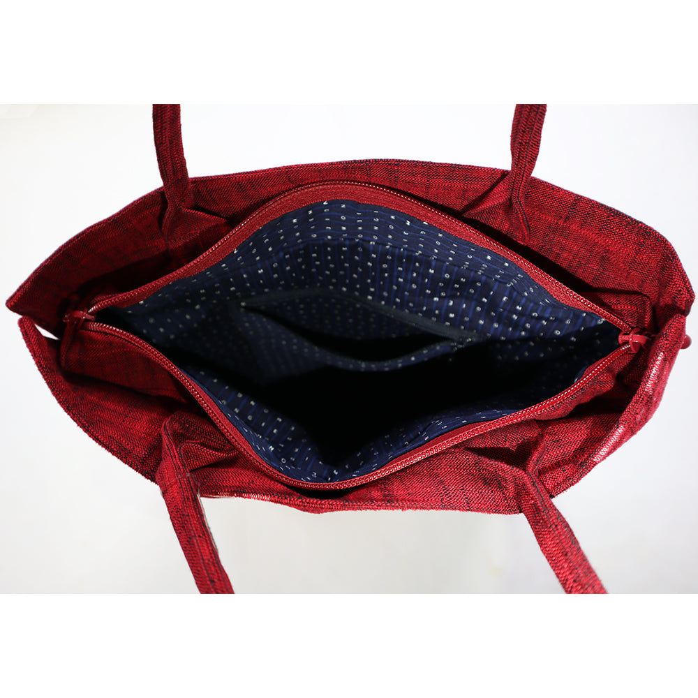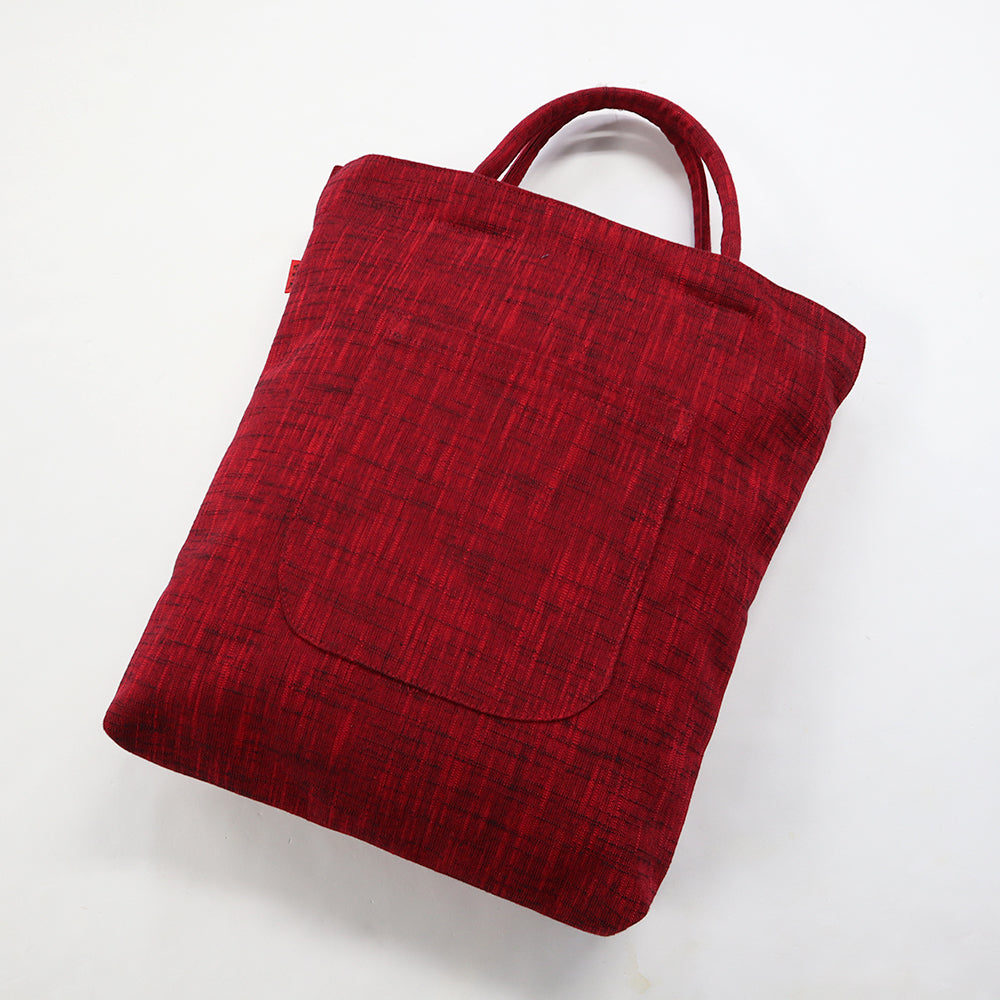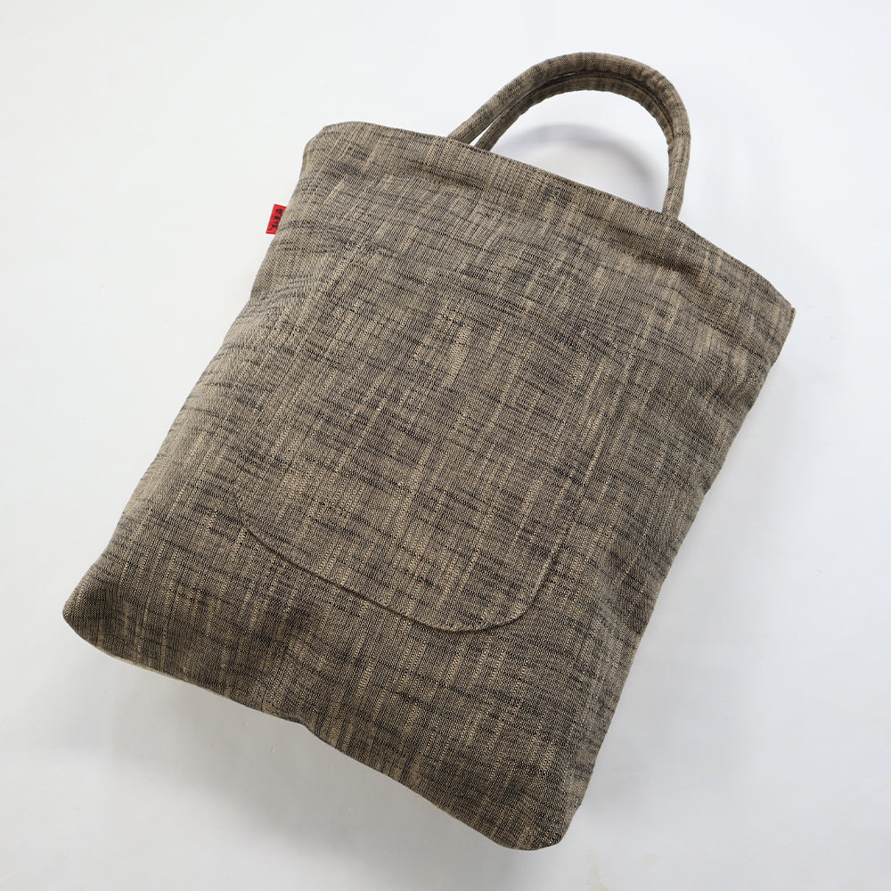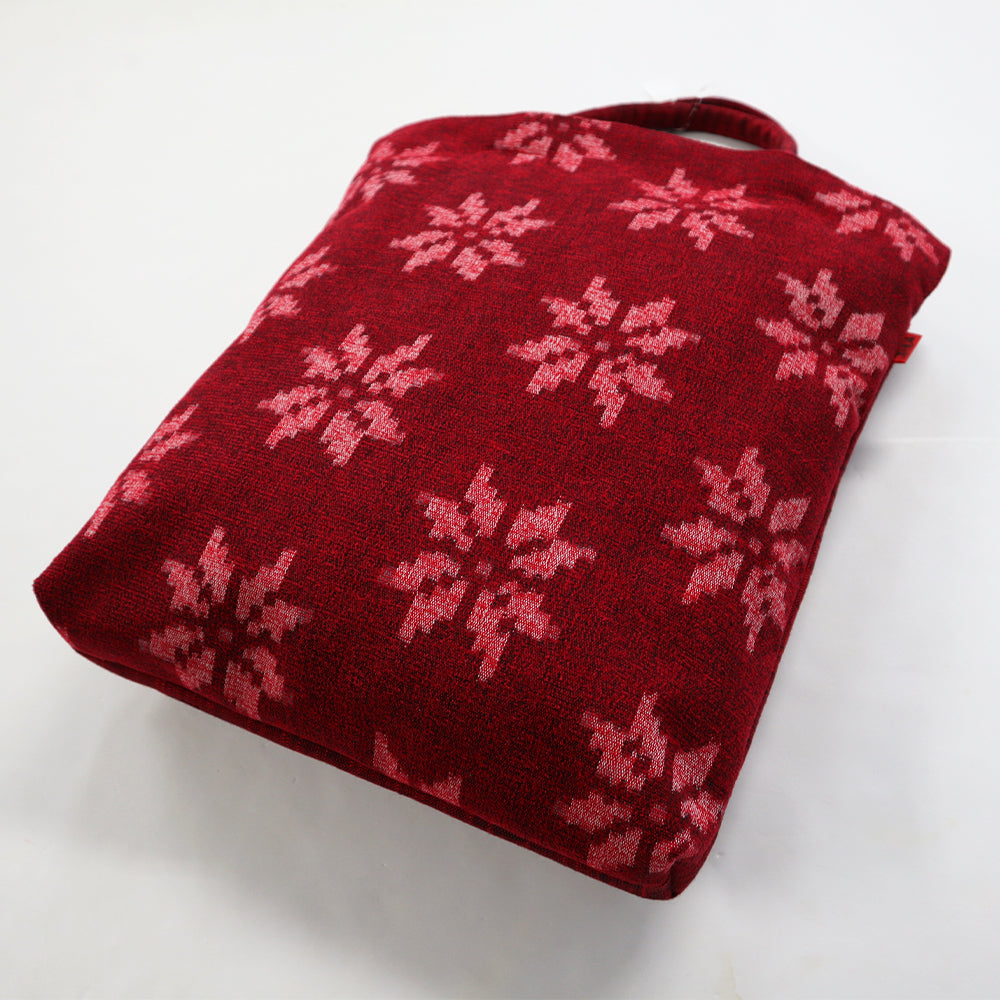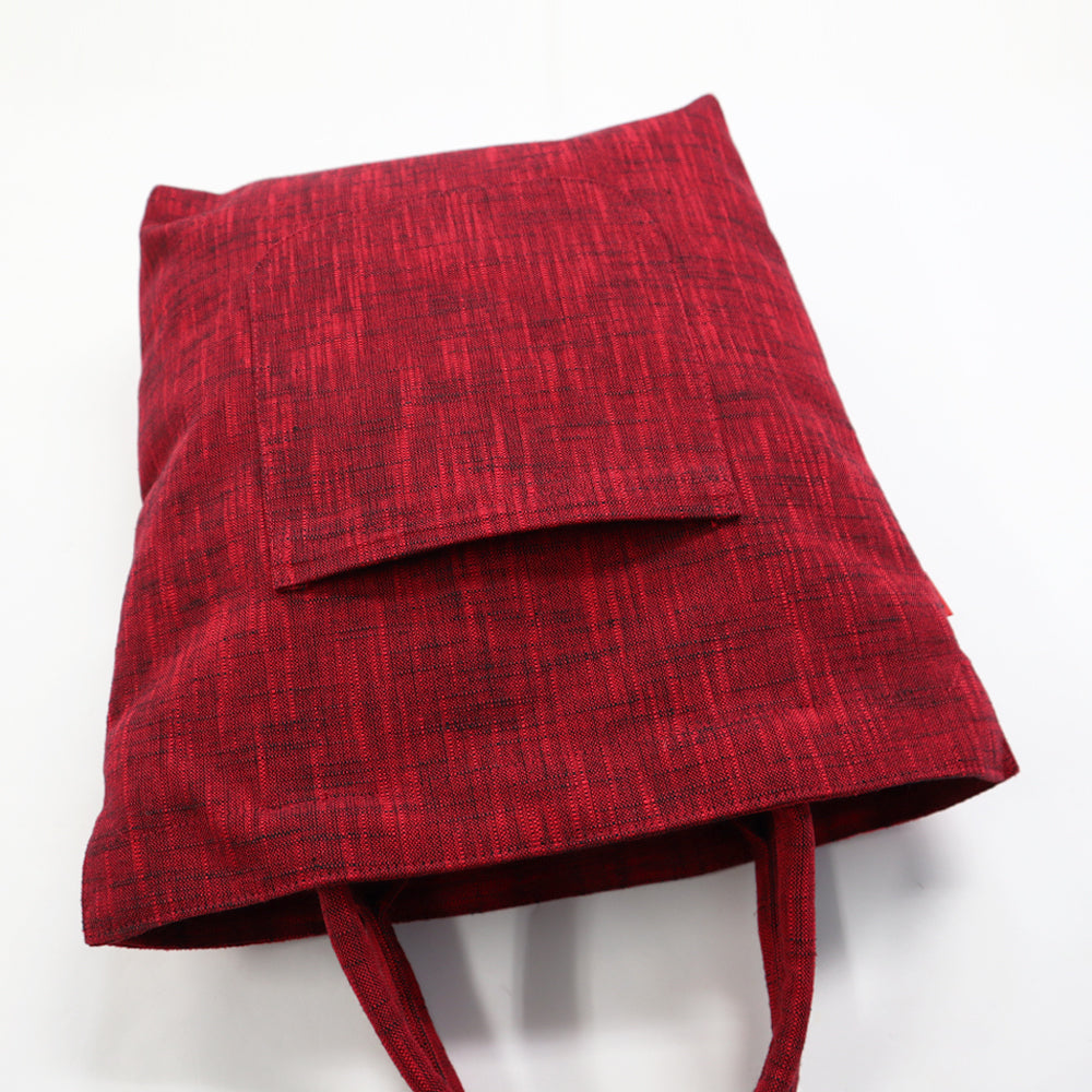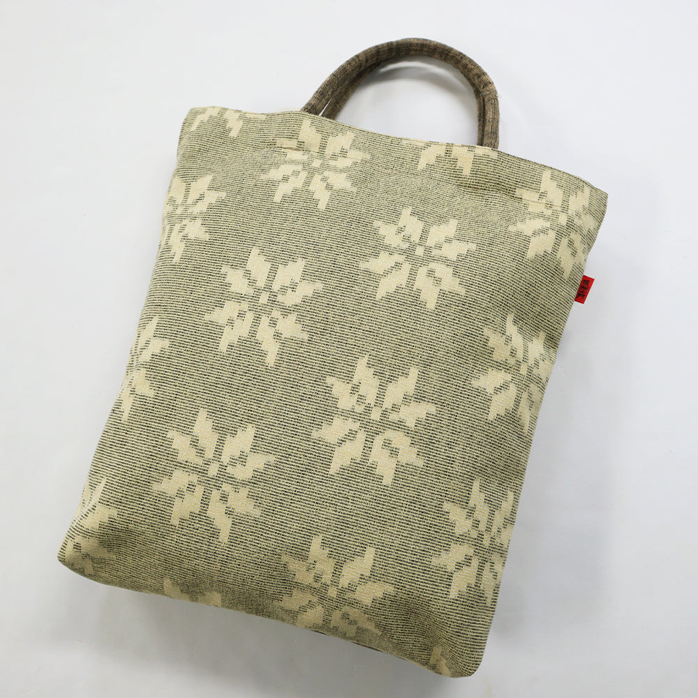 ボストンポシェットと同じモール糸を使用した雪華紋柄。久留米絣の反幅を十二分に生かされた柄の映えるトートタイプ。前面のみ雪華紋柄を使用し、他は白樺の無地絣で配色しました。ポケットは、背面にパッチポケット、中袋にファスナーポケット有りです。