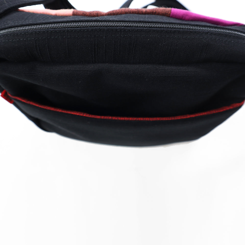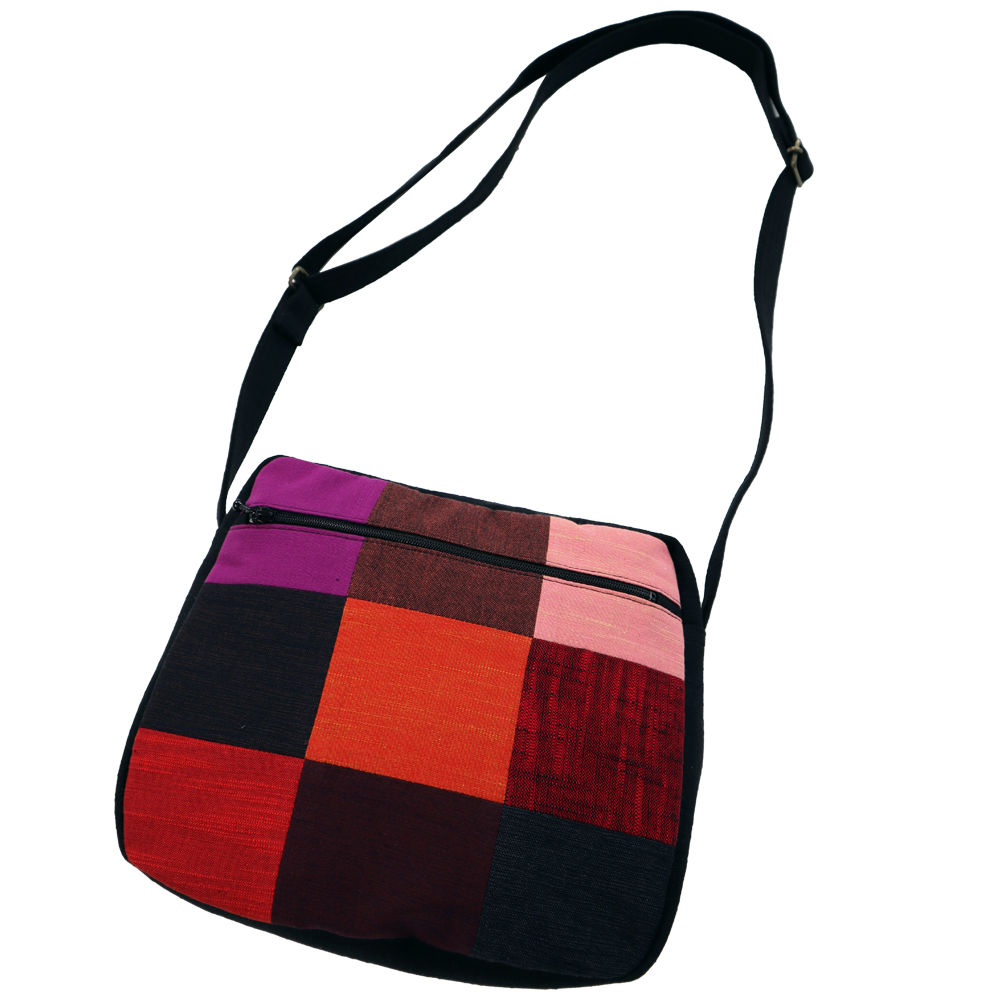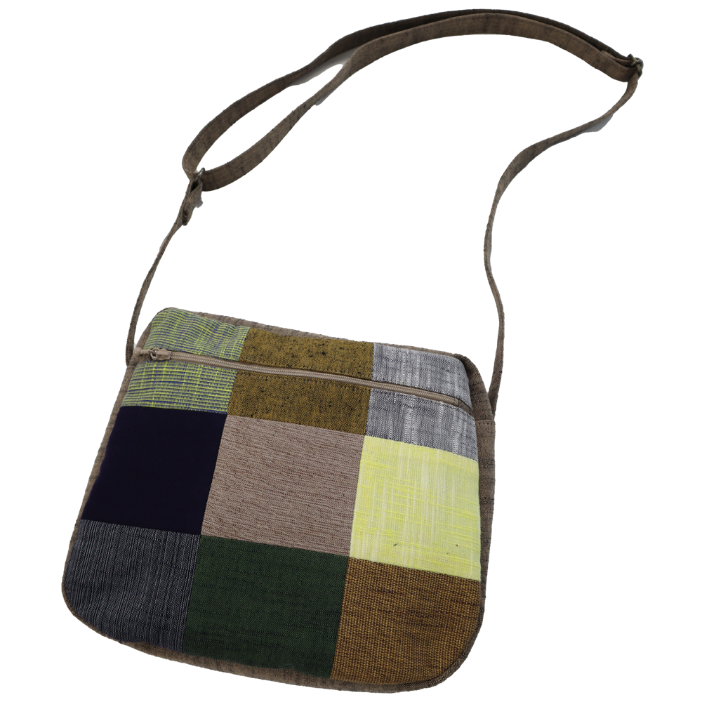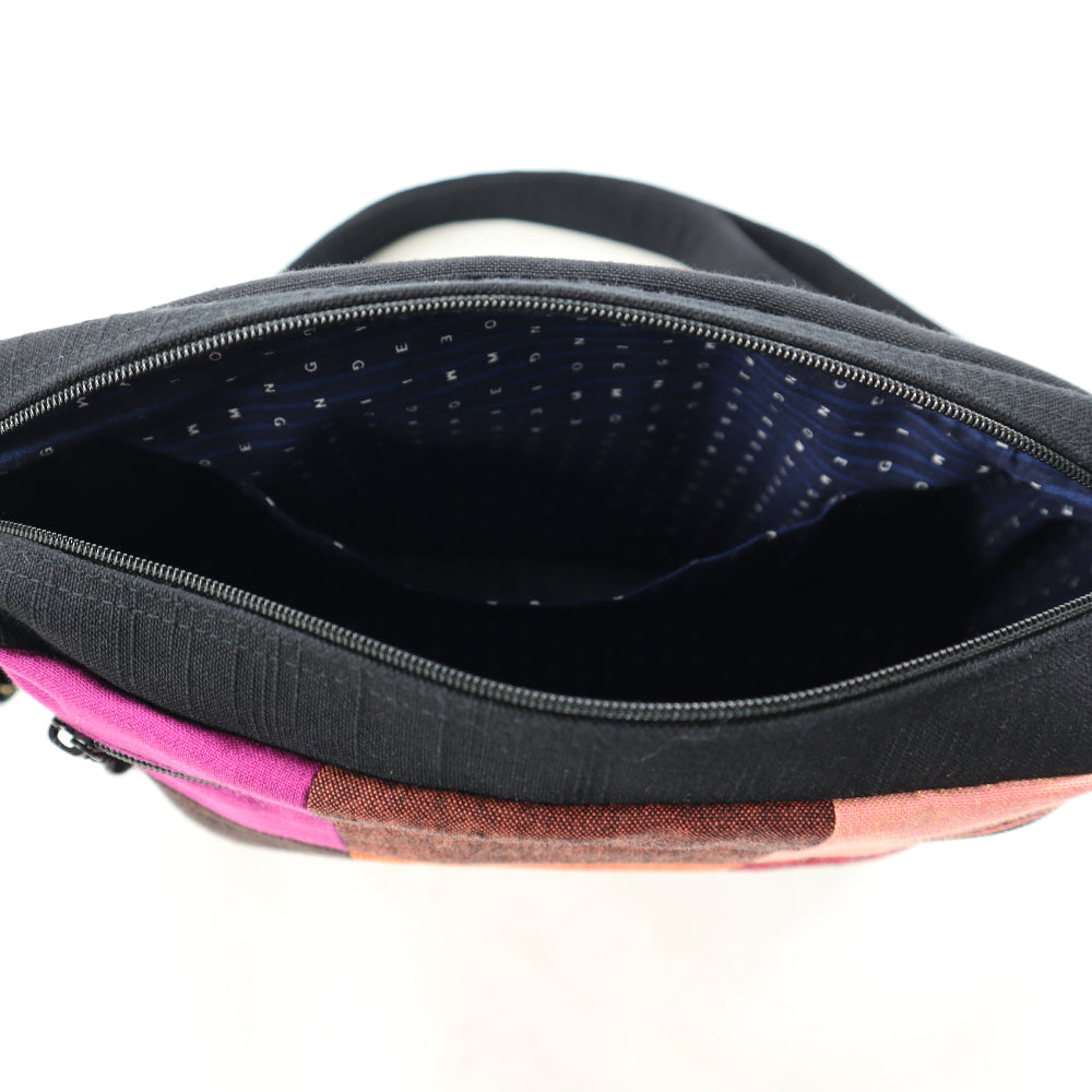9色の色とりどりの配色がカラフルで楽しいデザイン。前面のパッチワークのデザインにファスナーポケット、背面にカラー吹き出しのちらりポケット、中袋にパッチポケットの仕様になっています。長財布のはいるたっぷりしたサイズです。