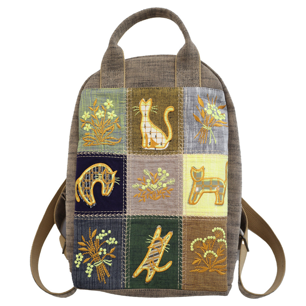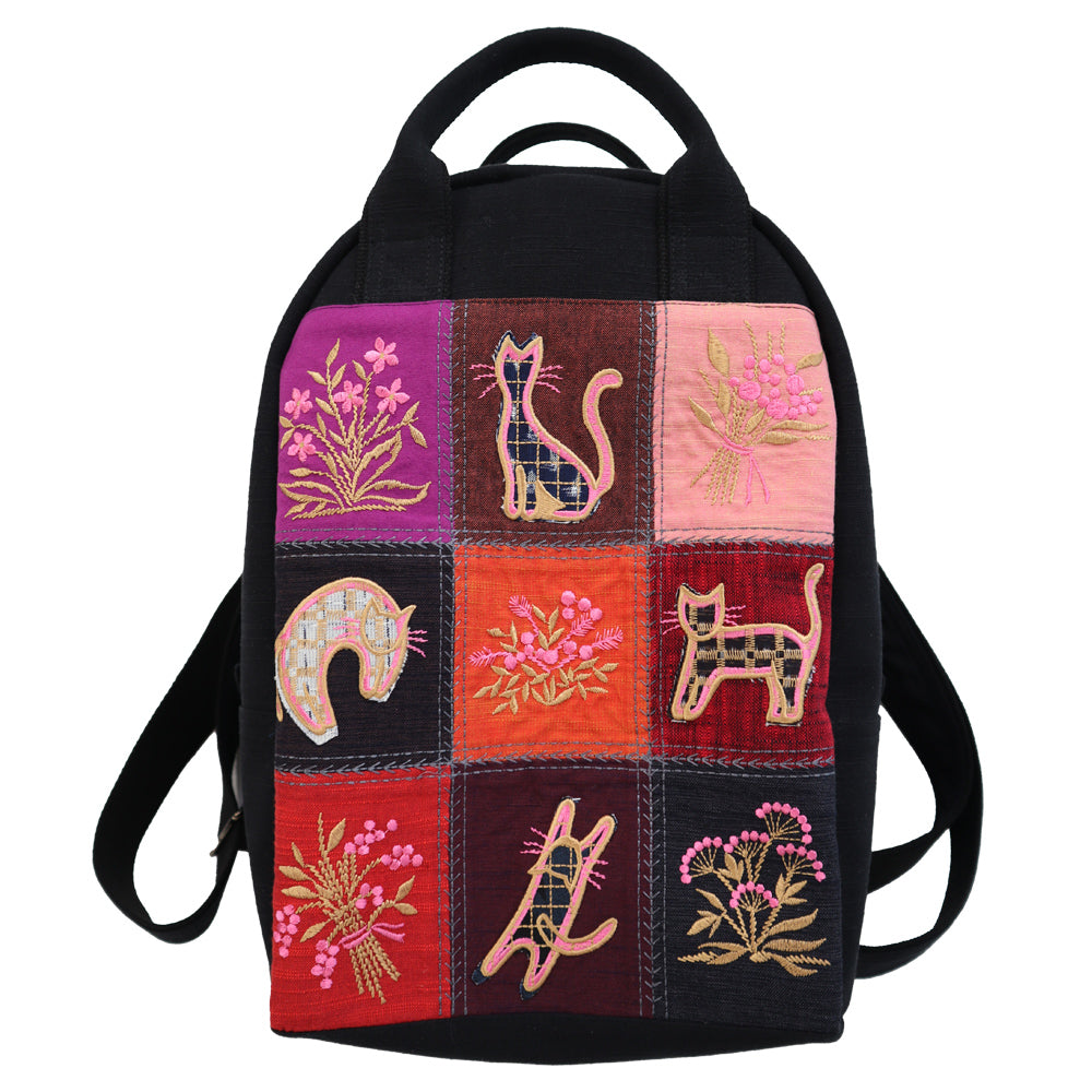 9色の色とりどりの配色に猫ちゃんと花々の刺繍を施した豪華なパッチワーク。フランスのパッチワーク、クルトポワントからの着想のデザインです。猫ちゃんは貴重な小柄の久留米絣を使用していますので、じっくり見てください。たっぷりなマチタイプなのでA4がはいり大容量いけます。背面ファスナーポケット、中袋パッチポケットの仕様。