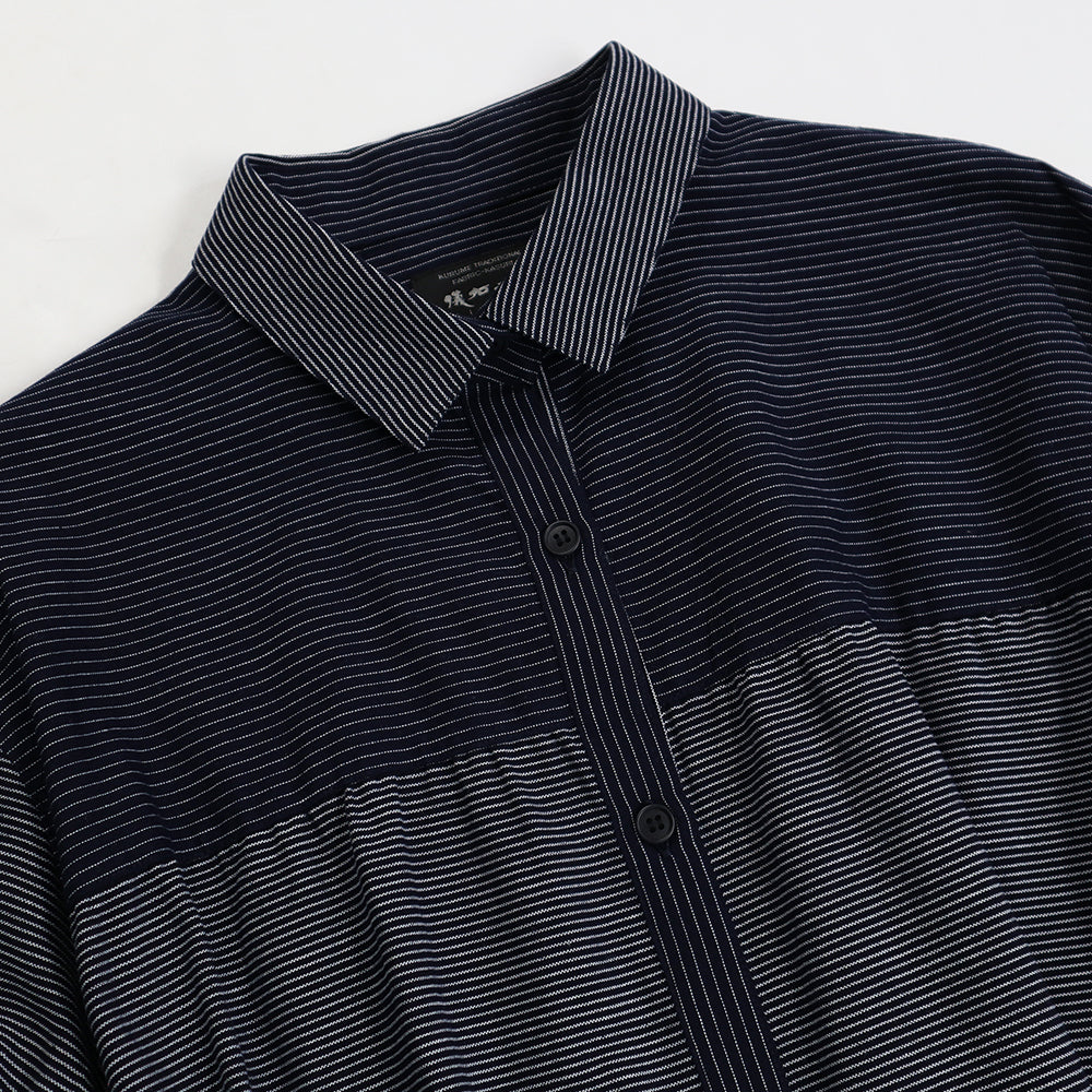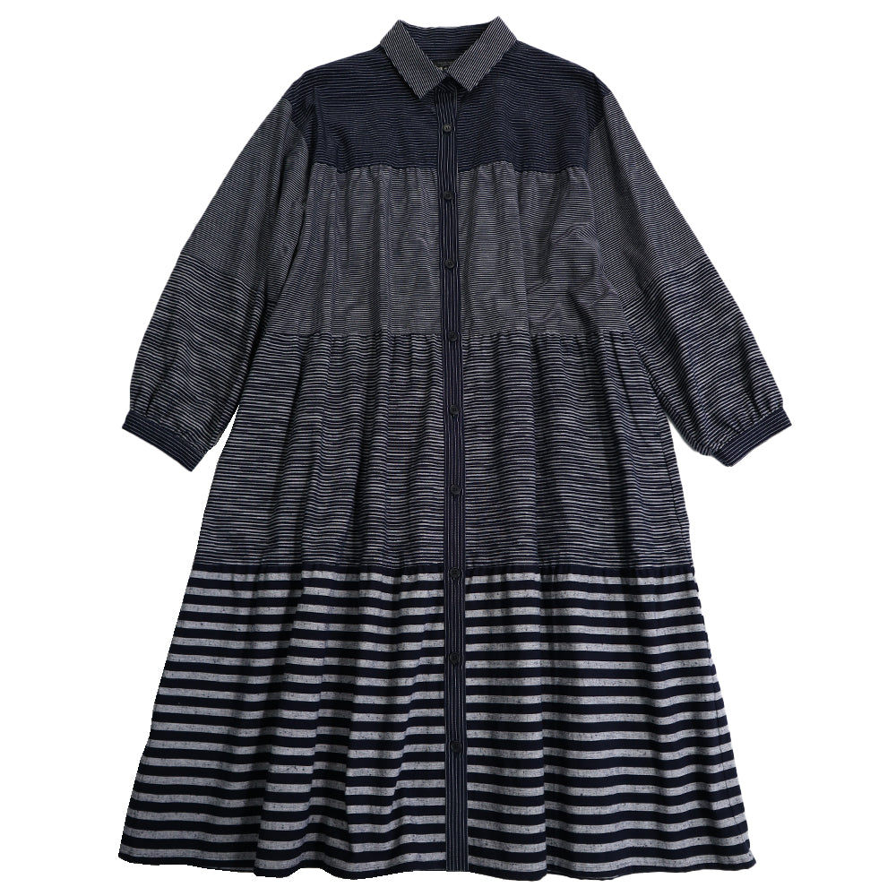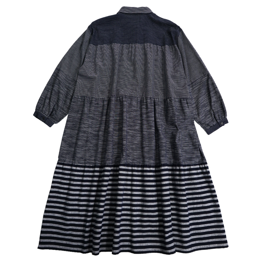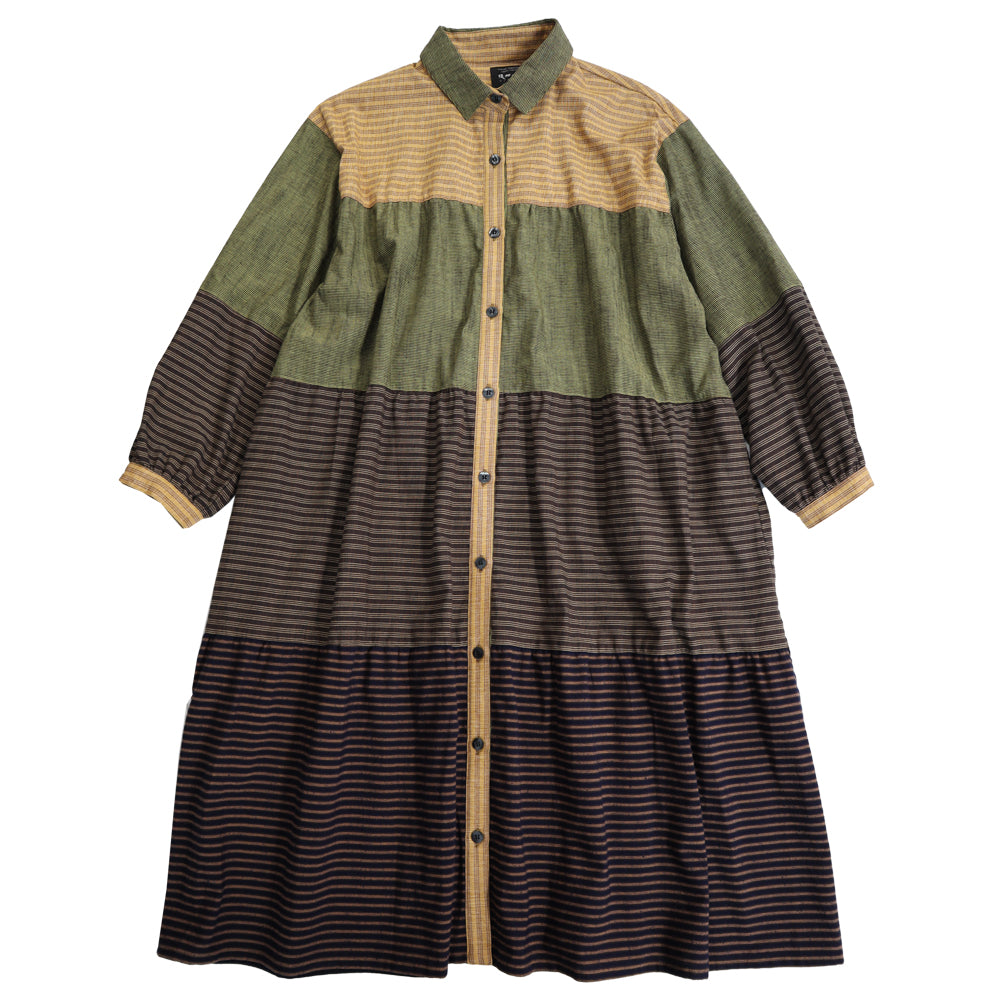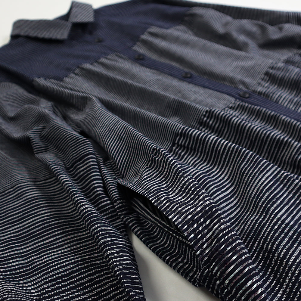 全体を大・中・小のバイヤスで刻み、6種類の異なる素材を組み合わせて配色した、表情豊かなワンピースです。動くたびに色柄のニュアンスが引き立ち、奥行きのあるデザインに仕上がっています。前開き仕様なので、ワンピースとしてはもちろん、羽織りのコートとしても着こなしを楽しめ、季節やシーンに合わせて自由にスタイリングができます。バイヤスに生地をとることで、ほどよいストレッチ感と自然な落ち感を実現。シルエットを美しく見せながら、快適な着心地を叶えます。