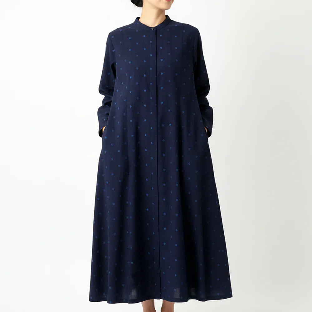 前を比翼仕立てにすることで、ボタンをすっきりと隠し、上品で洗練された印象に仕上げたワンピースです。シンプルな中にも丁寧な仕立てが光り、上質感のある大人のスタイルを演出します。裾にかけてやわらかく広がるAラインシルエットは、体のラインを拾いすぎず、自然にスタイルアップを叶えてくれます。動くたびにふんわりと揺れるシルエットが女性らしさを引き立て、軽やかな印象に。