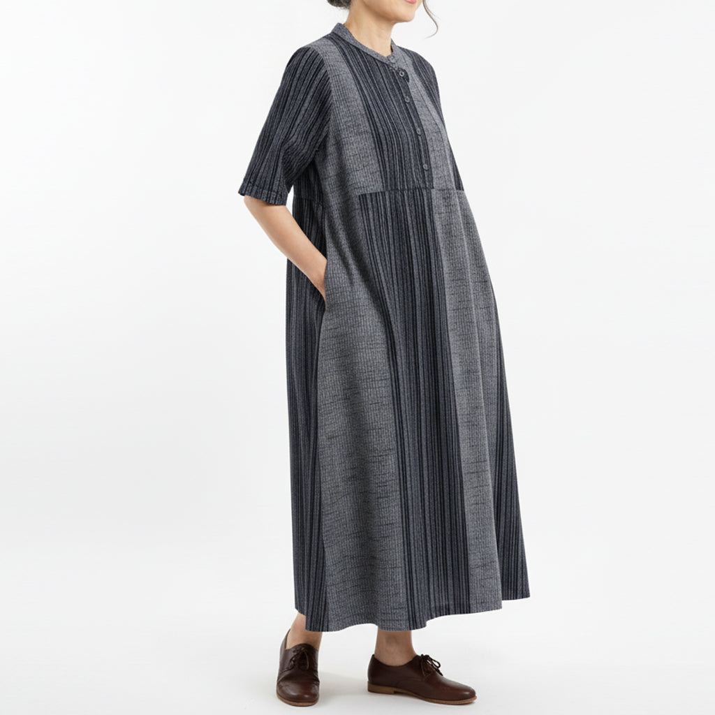 前身頃、袖口、背中心に2ミリ巾のピンタックを施したデザインワンピース。