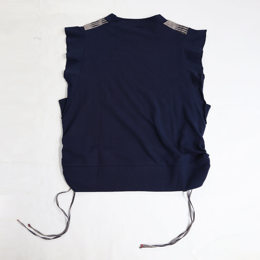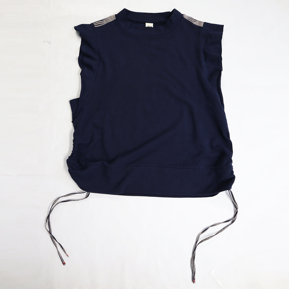 ガーゼ裏毛のプルオーバーのベスト。軽くて柔らかい心地よい素材感が魅力的です。肩ヨーク、裾紐に久留米絣を施しデザインポイントにしました。紐先と脇部分に赤いカンドメを施しアクセントになっています。袖部分はラッフルでメロー仕上げにして優しい感じにしました。