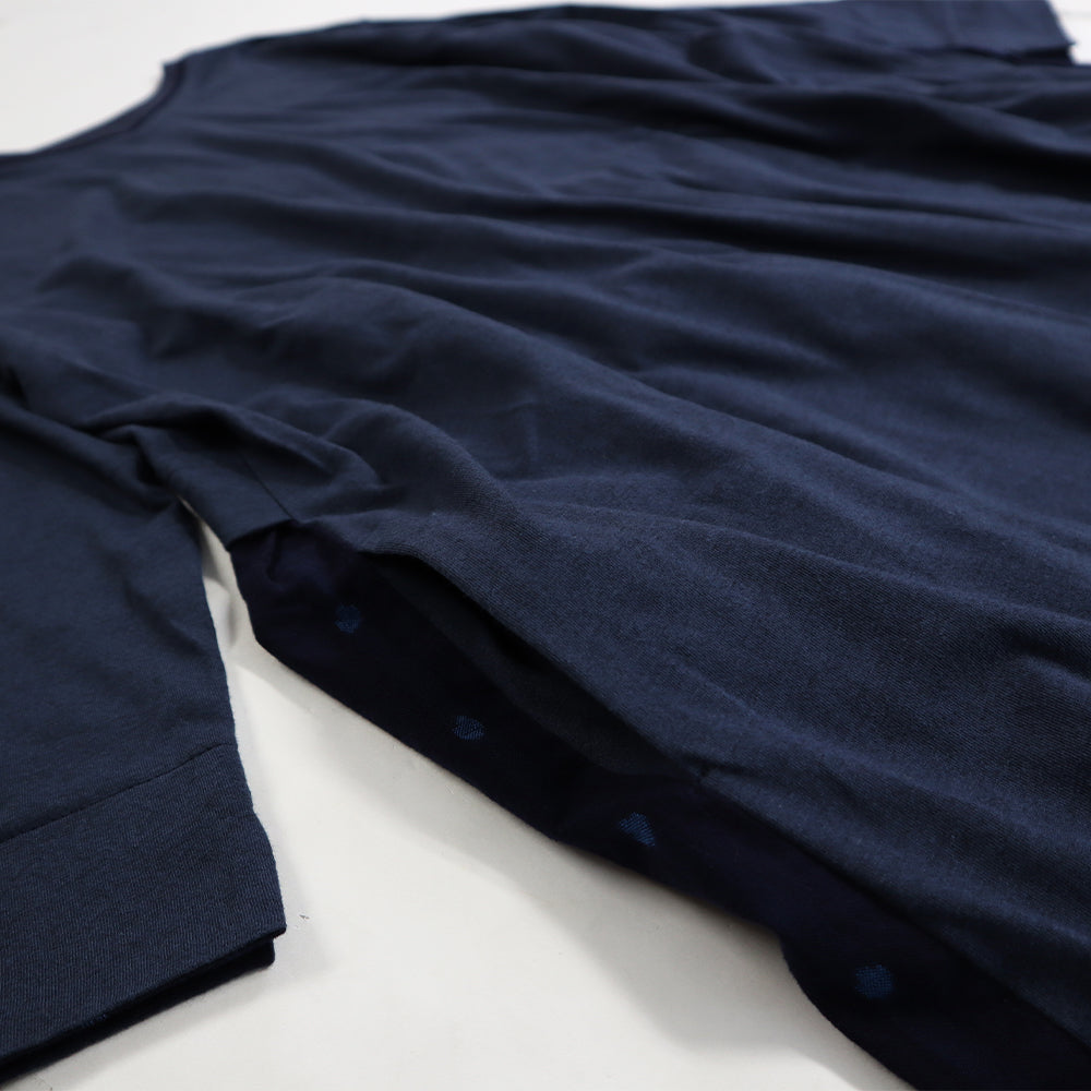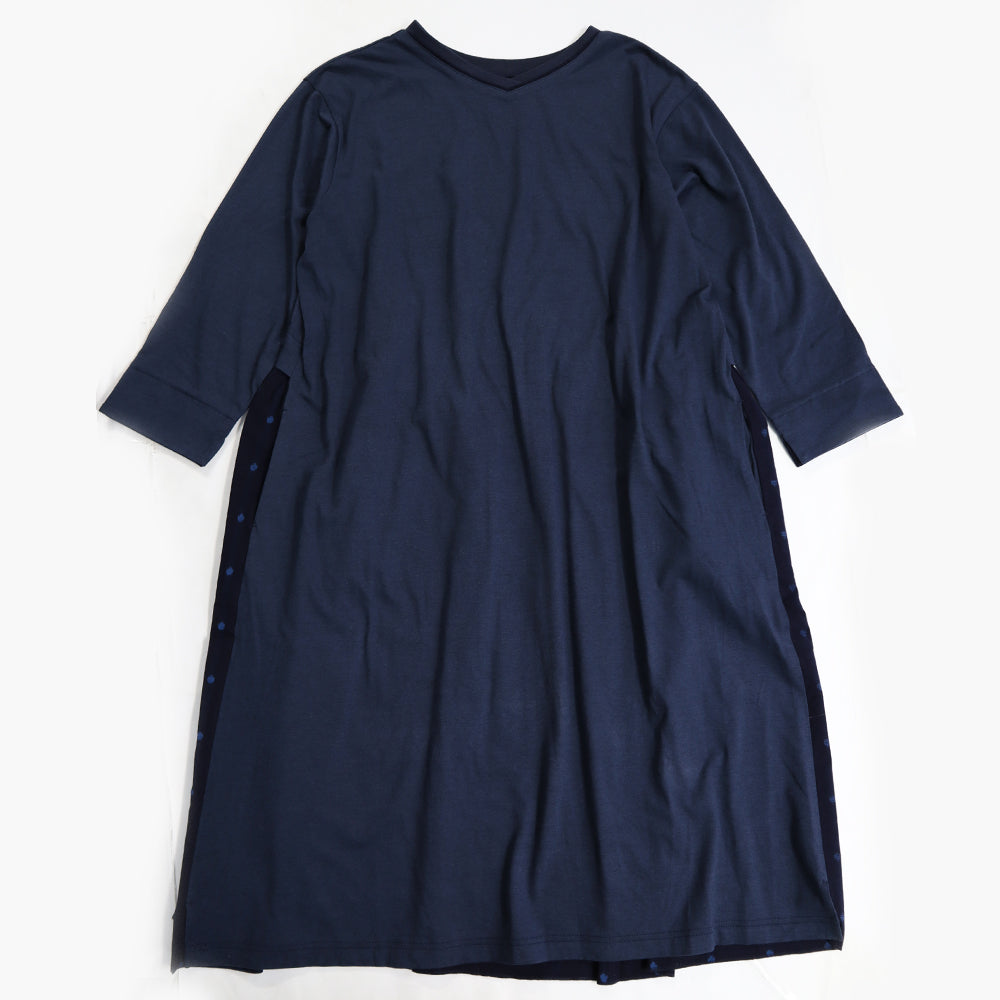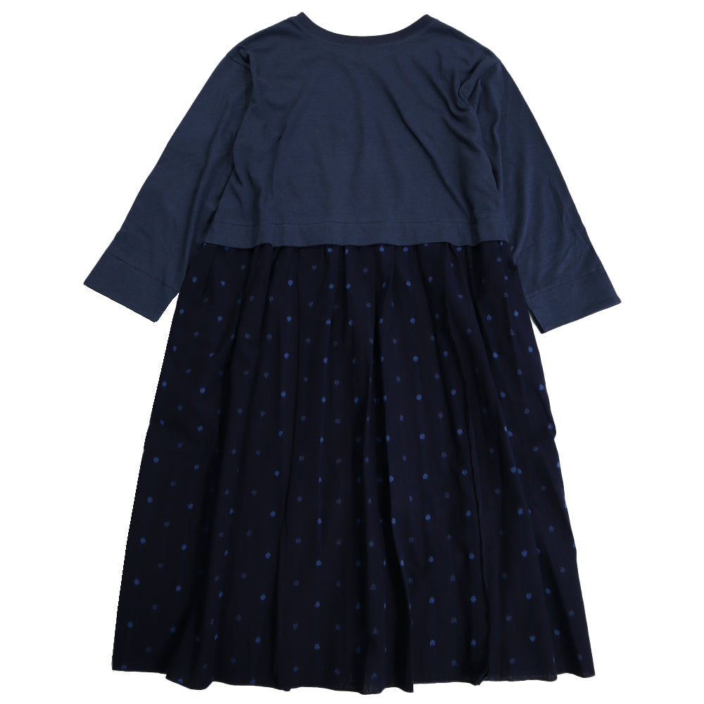 コットンウールのワンピース。優しい風合いで着心地がよく、温かみのある素材に仕上がっています。コットンウールの独特なメランジ調の表情の深みをもたらしています。最大のデザインポイントは、前後どちらを前にしても着られる2WAY仕様です。後ろ見頃のスカート部分、襟の吹き出しに久留米絣を使用しデザインポイントにしました。前見頃は甘V襟のシンプルライン、後見頃はふんわりした久留米絣のスカート部分が可愛らしい優しいラインに仕上がっています。