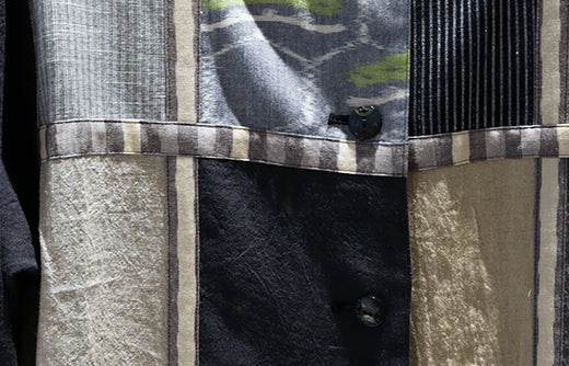 春の儀右エ門パッチワークコートOP。浜松の遠州織りの麻75%綿25%の先染め生地を使用しました。全体をパッチワークで仕上げ、ハギの部分に絣テープをのせ付けています。前後の顔回りに絣を4柄使い春らしい色合いで仕上げました。