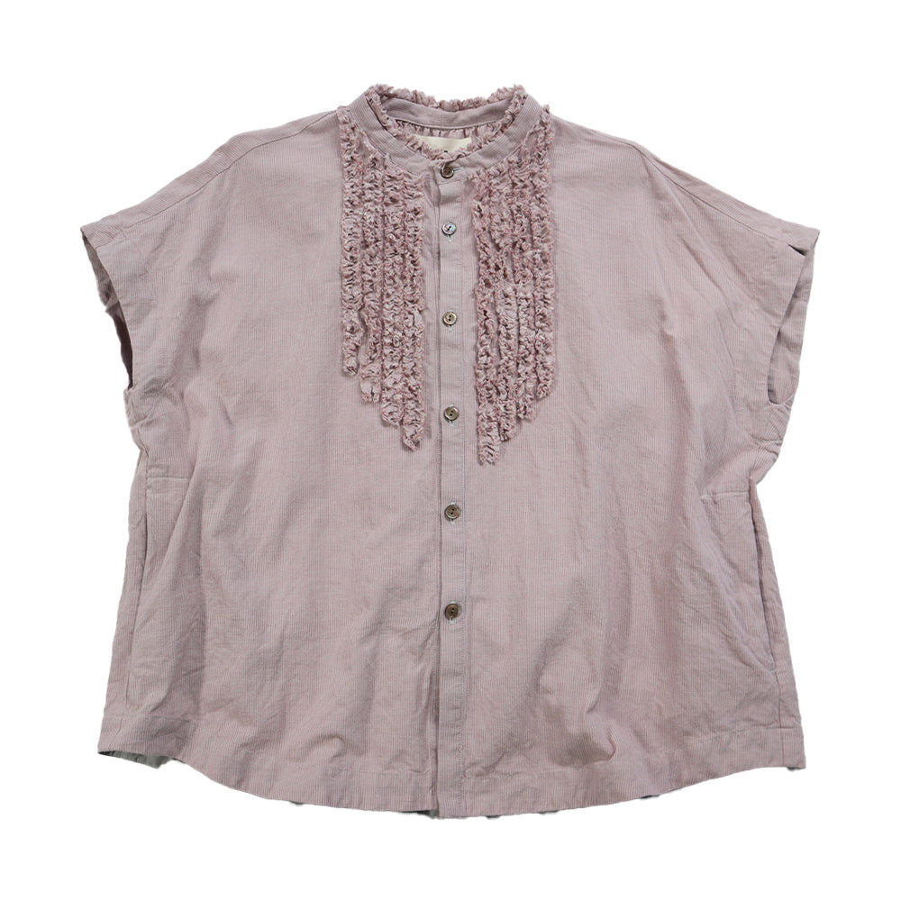 裁ち切りフリルがポイントで甘めなテイストに仕上げました。フリルをバイヤス裁ち切り始末にすることで軽さと抜け感が出ます。フレンチ袖で前開きなので、ベスト感覚でレイヤードするのもおすすめです。パンツにもスカートにも合わせやすい丈感でコーディネートしやすいブラウスです。