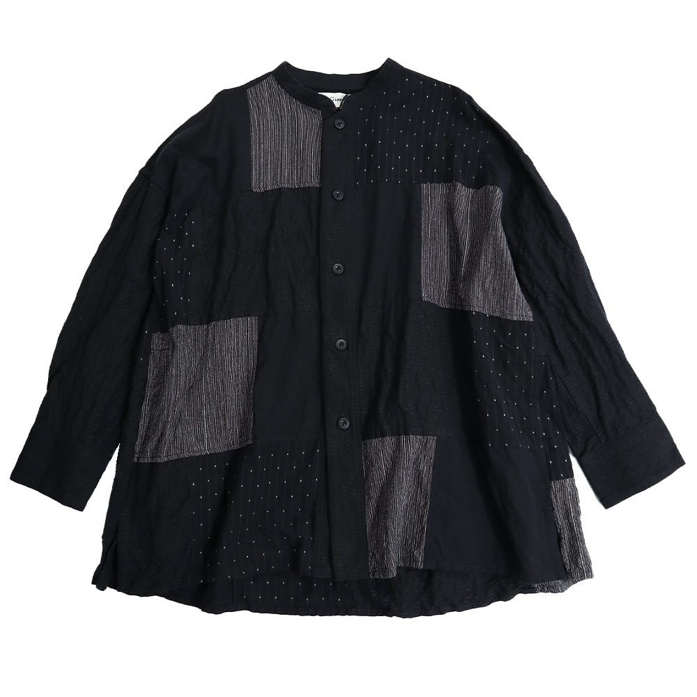 メンズライクなシルエットのシャツです。4素材を使用しランダムにパッチワークしました。袖口をロールアップしてラフな着こなしがおすすめです。