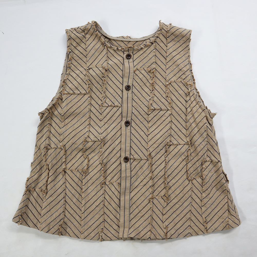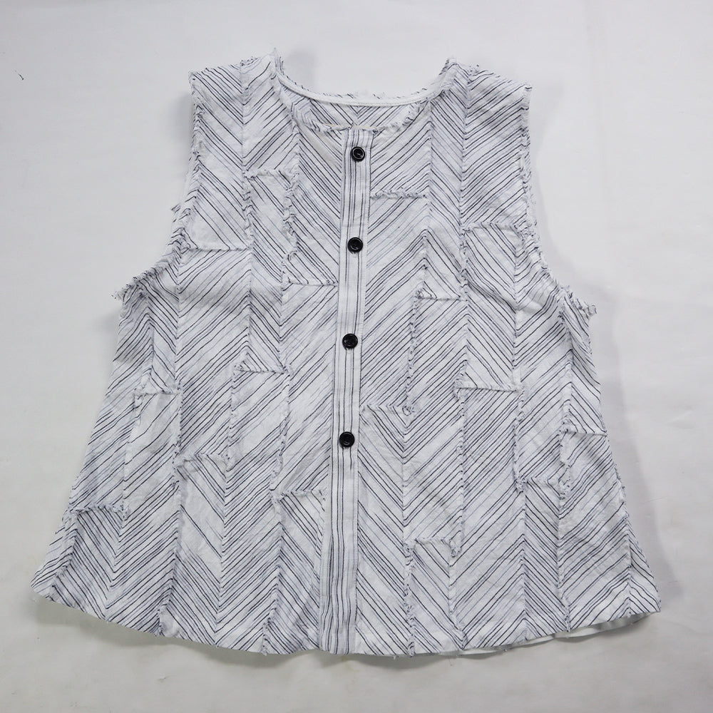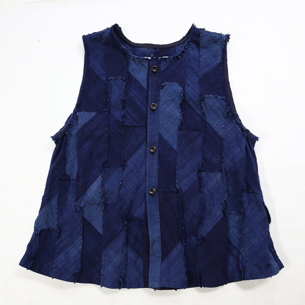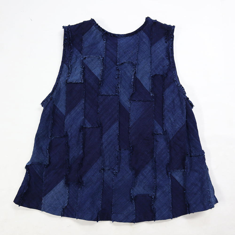 バイヤスパーツを裁ち切り、縫い代を表に出したスリーブレスブラウス。表に出すことで立体感を出し、1つの生地でいろんな表情が出るように地の目の向きにも拘りました。短め丈なのでボトムスはボリュームのあるものを合わるとバランスが取りやすいです。ベストのようにTシャツの上にプラスワンアイテムとしても着用していただけます。