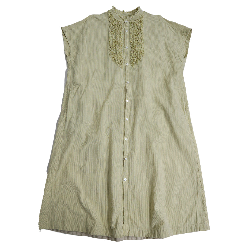 フリルをバイヤス裁ち切り始末にすることで軽さと抜け感が出ます。フレンチ袖で前開きなので、ロングジレの感覚でレイヤードするのもおすすめです。