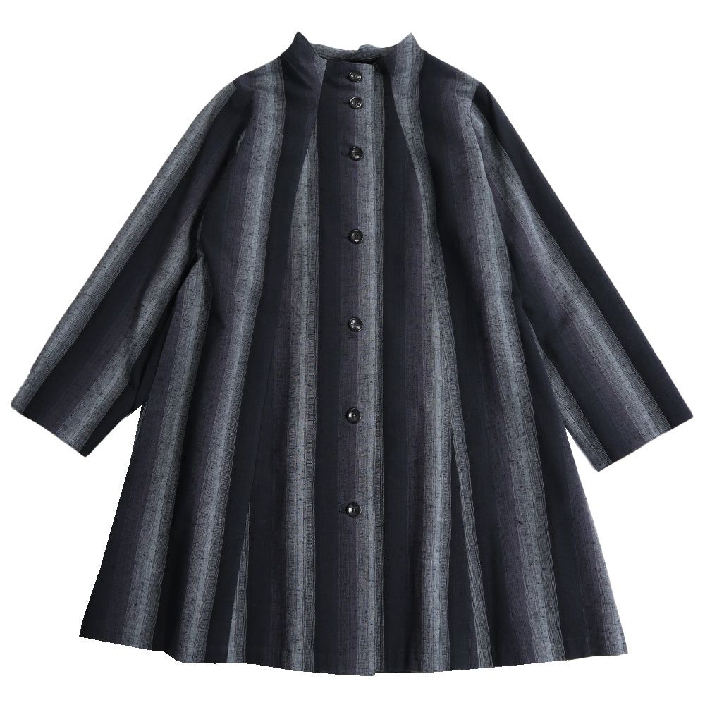 やわらかく広がるフレアラインが美しい裏地付きのコートです。動くたびに優雅に揺れるシルエットが女性らしい上品な印象を演出します。衿から続く曲線の切り替えデザインが、全体にやさしい雰囲気をプラス。シンプルな中にも表情があり、さりげなく個性を感じさせる仕上がりです。