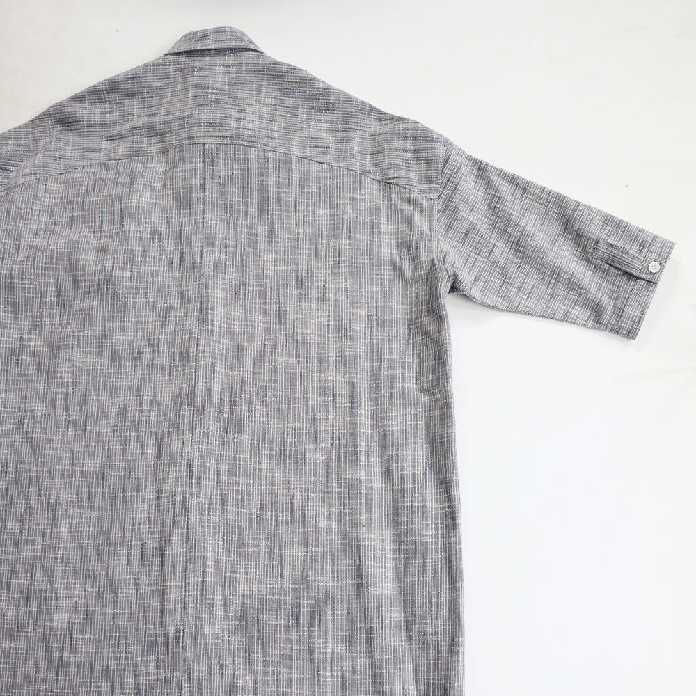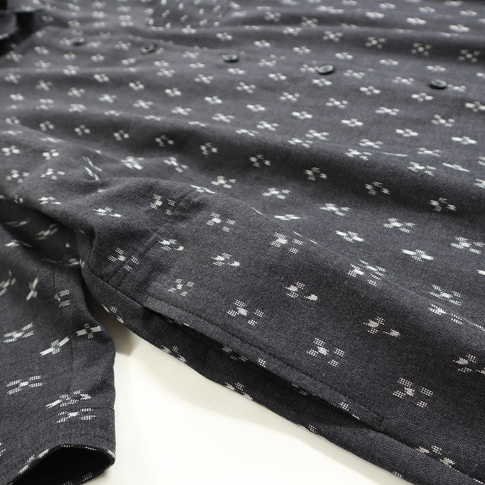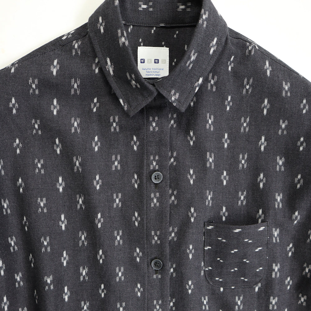 後ネックの見返しと左胸ポケットには、久留米絣の別布を使用し、さりげないアクセントに。細部までこだわったディテールが、シンプルな中にも個性と温もりを添えています。