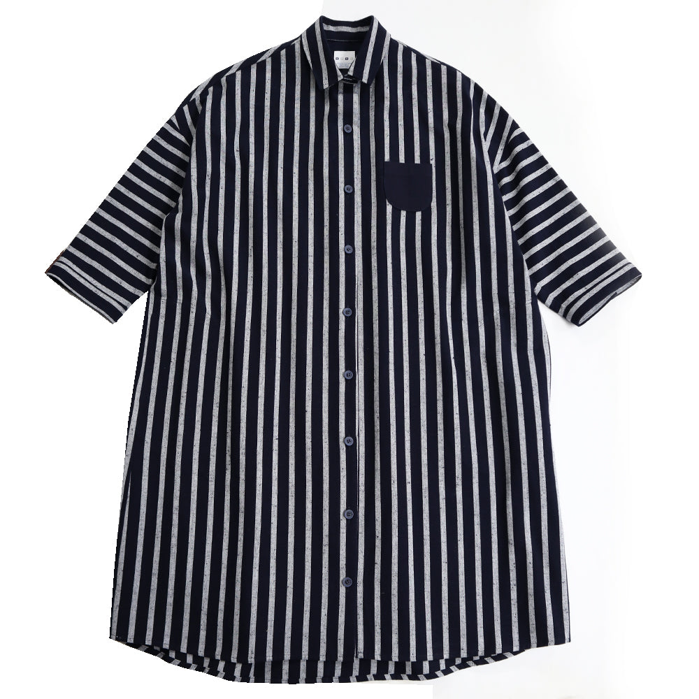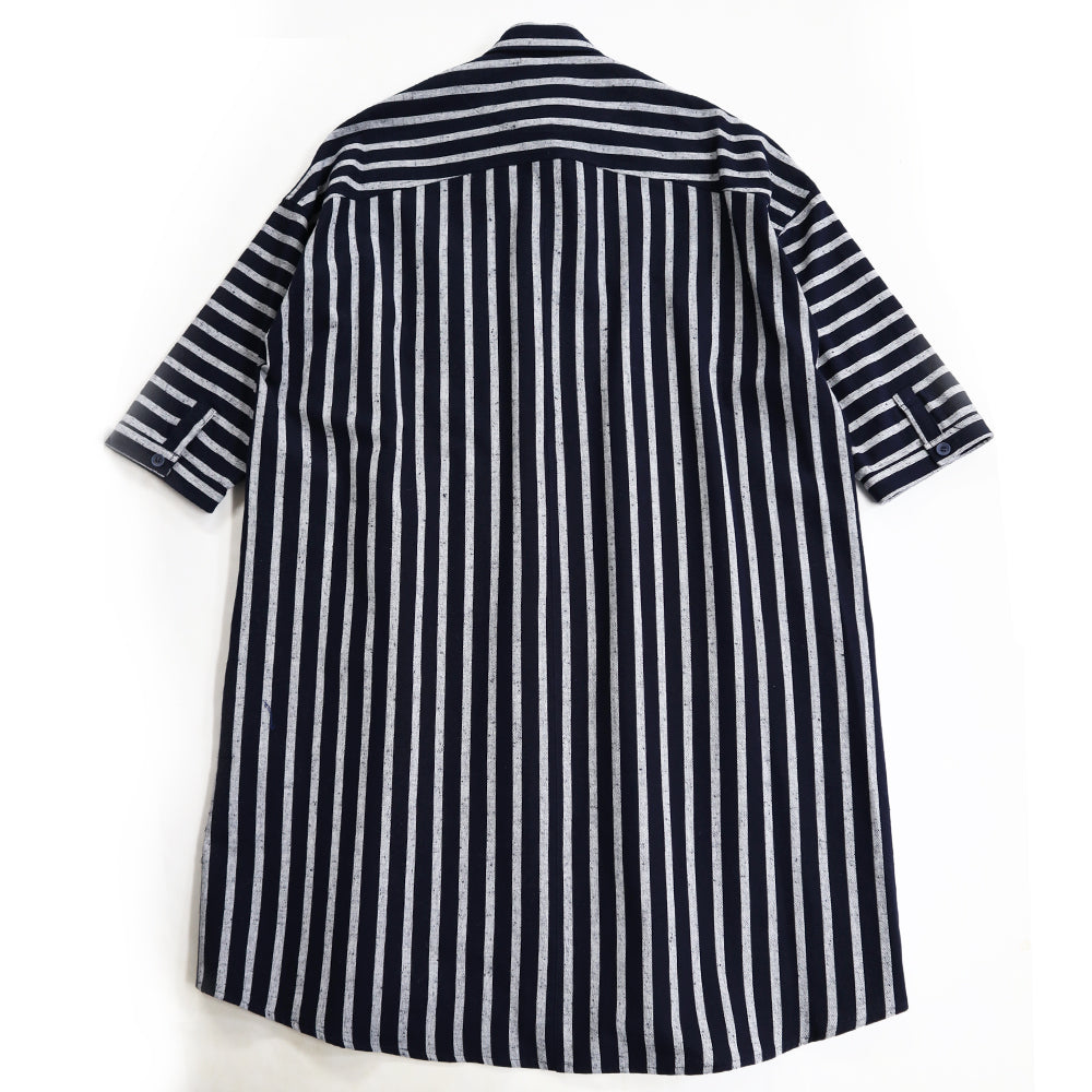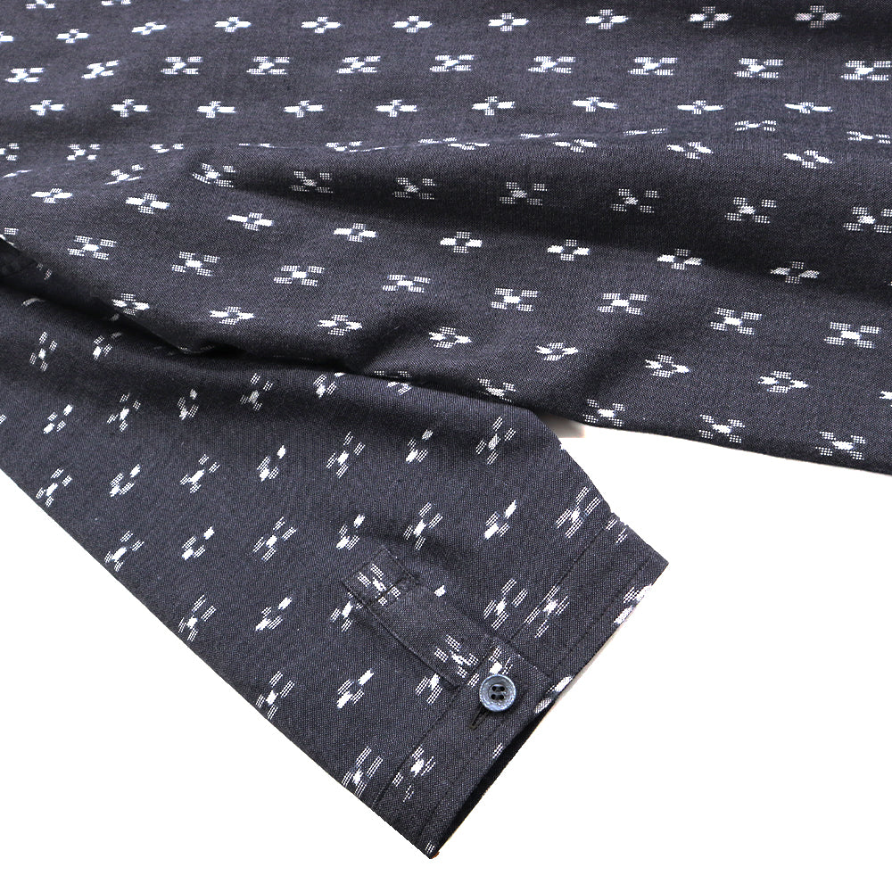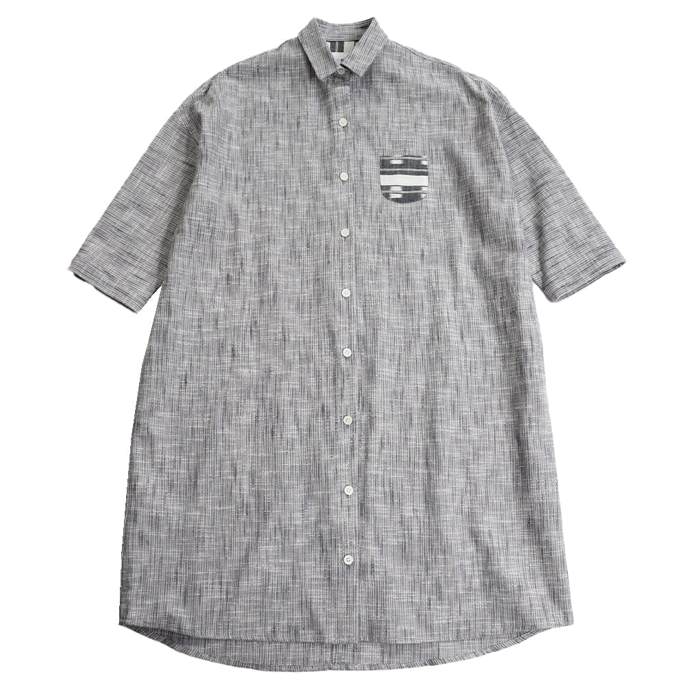 後ネックの見返しと左胸ポケットには、久留米絣の別布を使用し、さりげないアクセントに。細部までこだわったディテールが、シンプルな中にも個性と温もりを添えています。