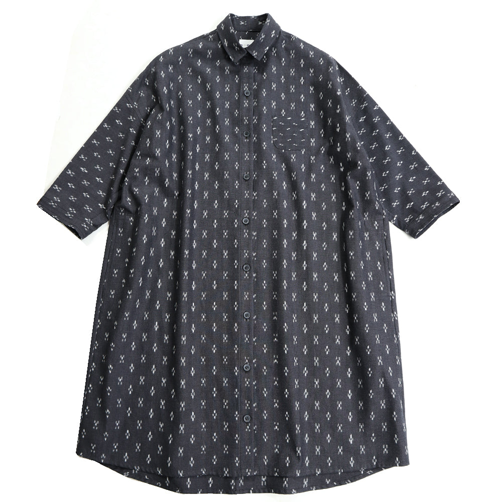 小さめの衿と、たっぷりとした身頃のバランスが絶妙な久留米絣ワンピース。すっきりとした衿元が全体を引き締め、ゆとりのあるシルエットがやさしく身体を包み込む、着る人を選ばないデザインに仕上げました。