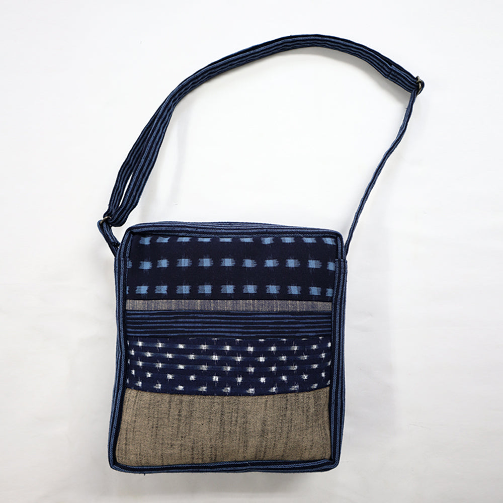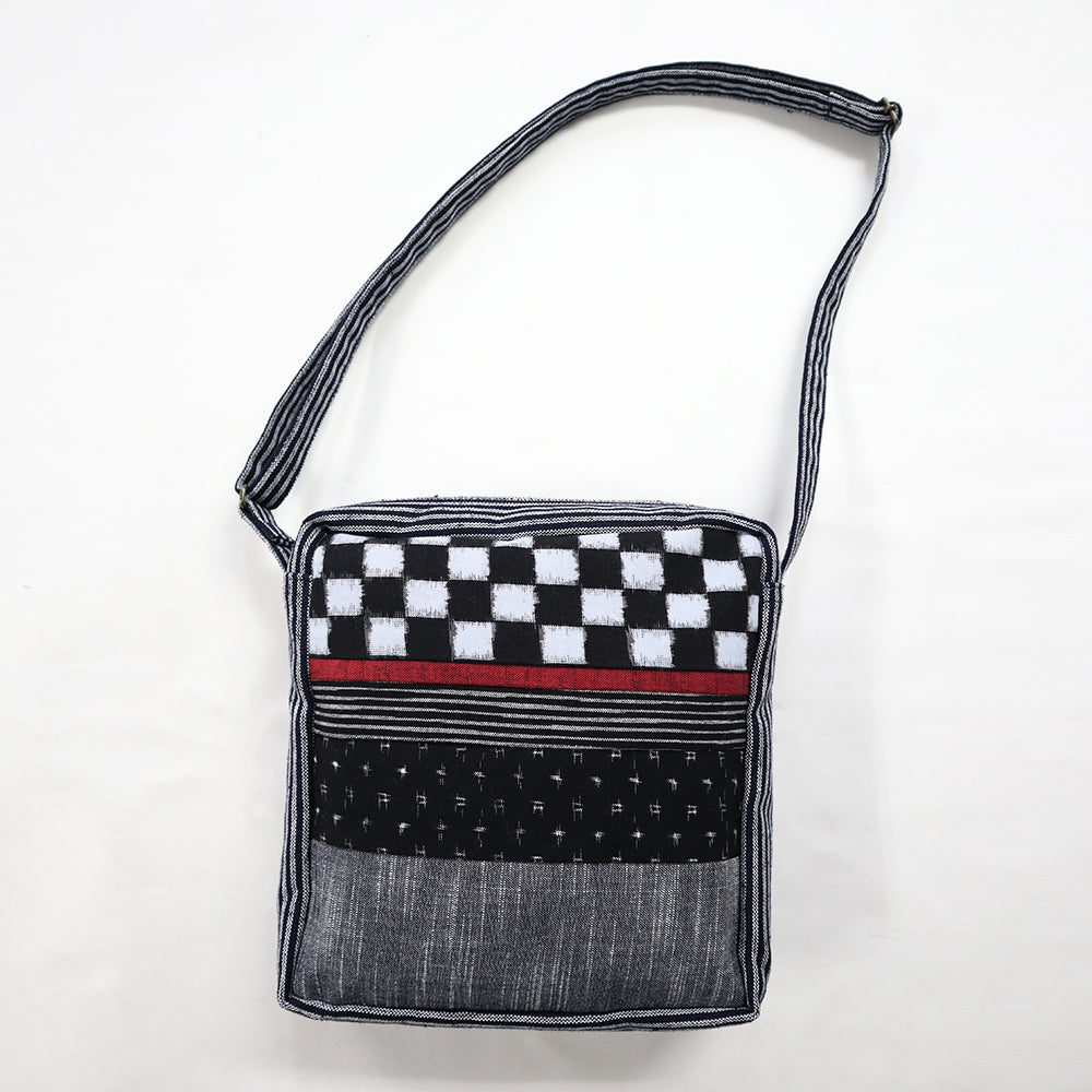今シーズンは、本体色にざっくりした棒縞文様(ぼうじまもんよう)の太い縦縞で、地の糸と縞の糸がほぼ同じ幅で並んだ生地を使用しています。コーディネートによって表裏使いを楽しめる柄になっています。パッチワークの素材は久留米絣らしい経緯絣を主に小柄と中柄を飛ばしバランスよく仕上げました。背面、中袋にポケット有り。