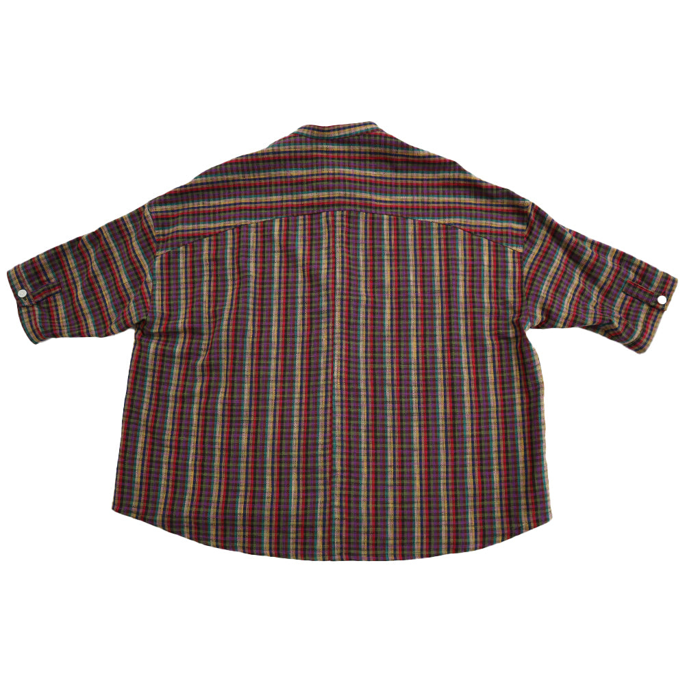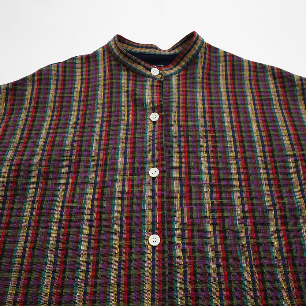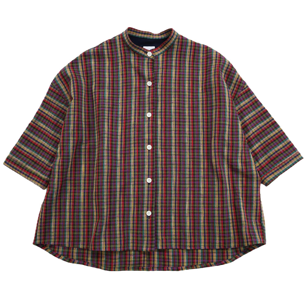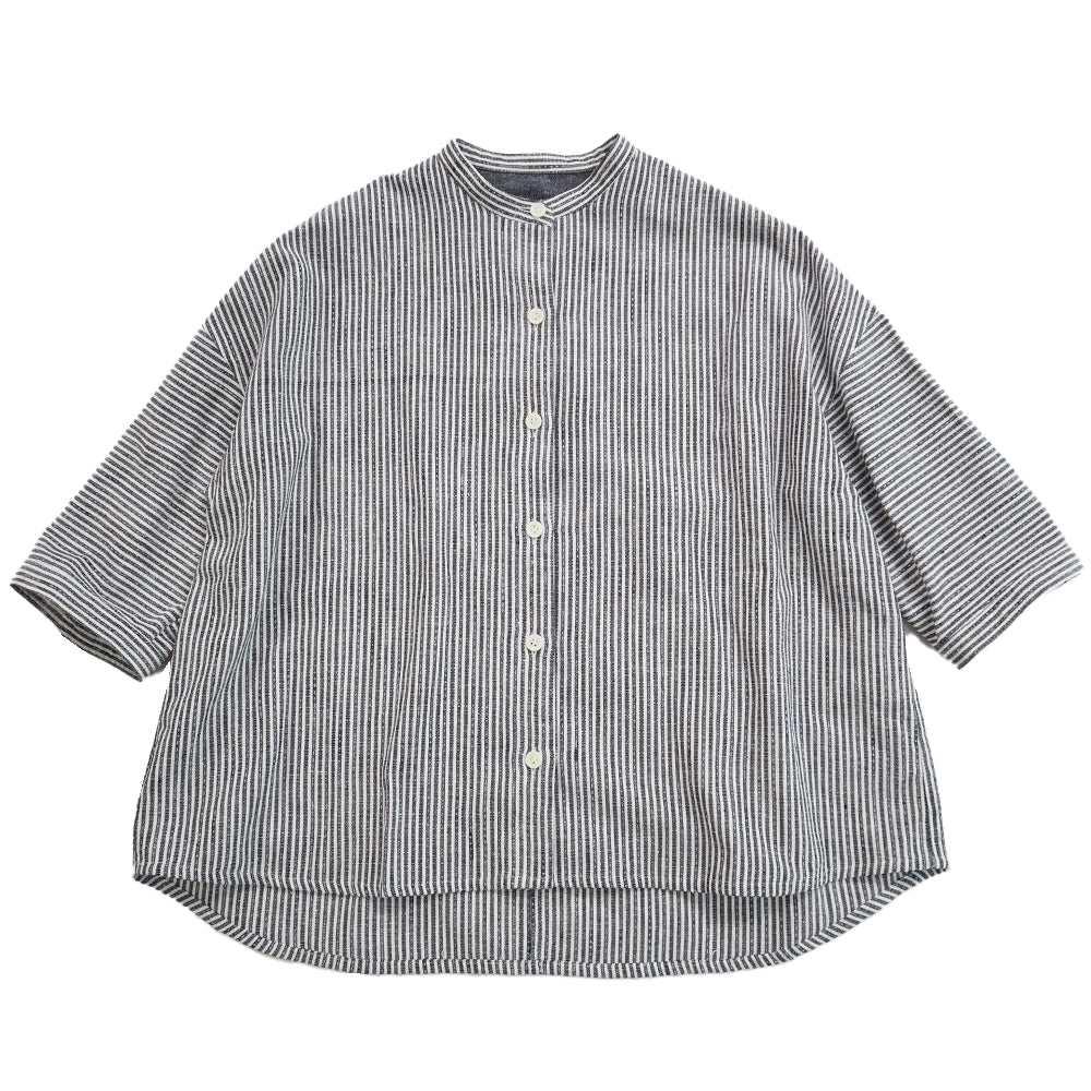 ギエモン定番ブラウスからスタンドカラーの五分袖ブラウスです。ゆったりとしたシルエットで前後差のある丈なのでルーズに着ていただくとこなれ感がでます。