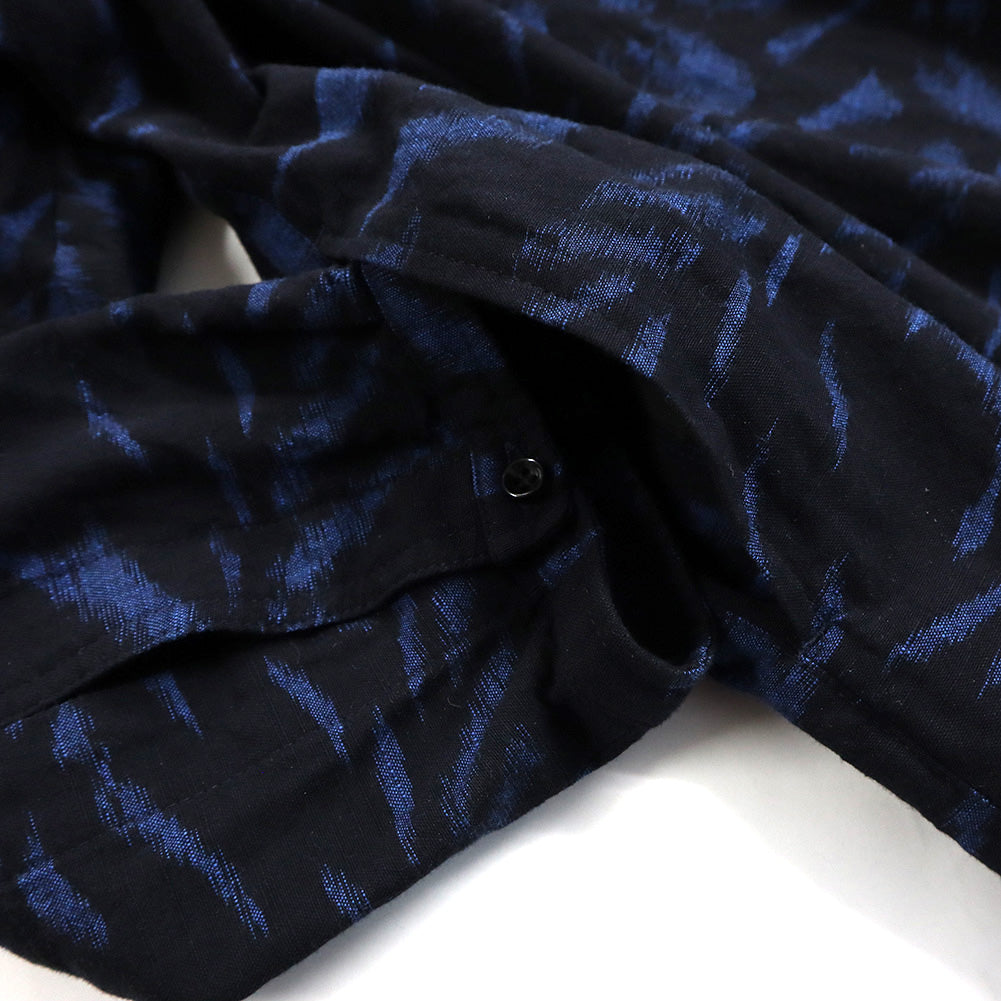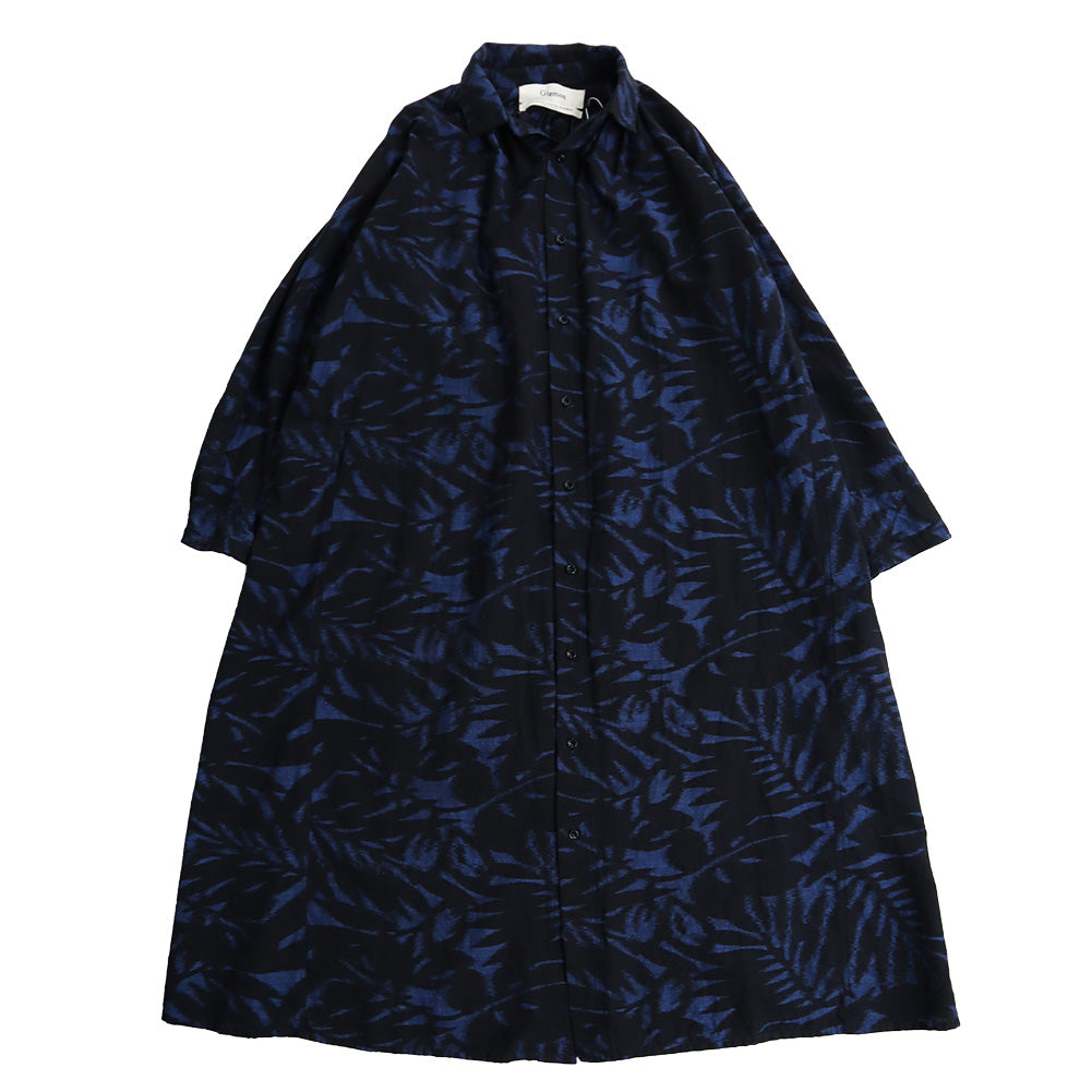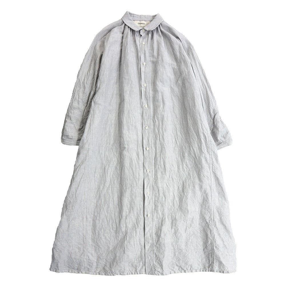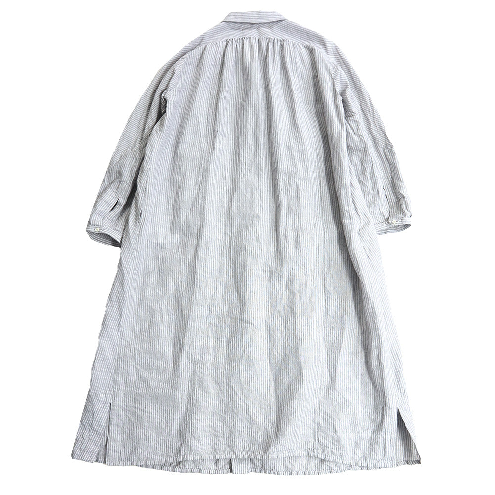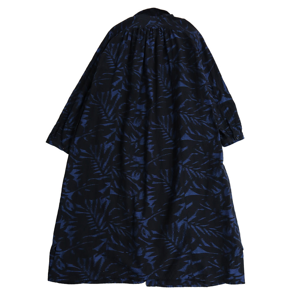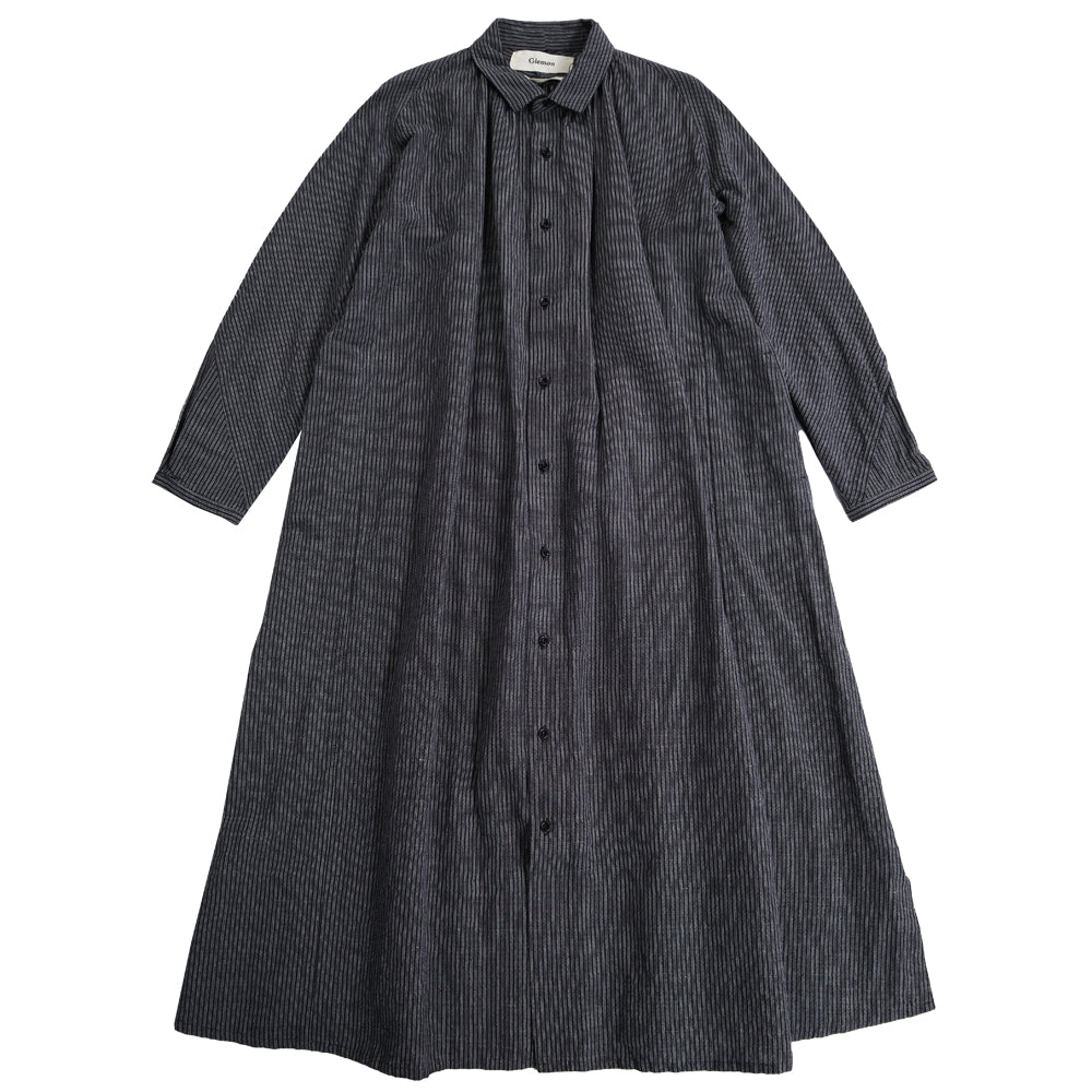 前後身頃にギャザーを入れたシンプルな久留米絣シャツワンピース。