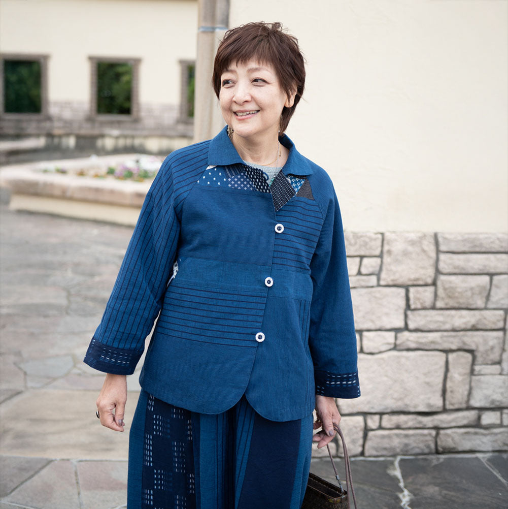 釦を止めても、衿を折り返した時にも顔まわりにパッチワークが見える様にしてさらに、ポケット口にもパッチワークを施しました。
