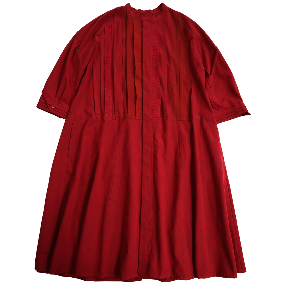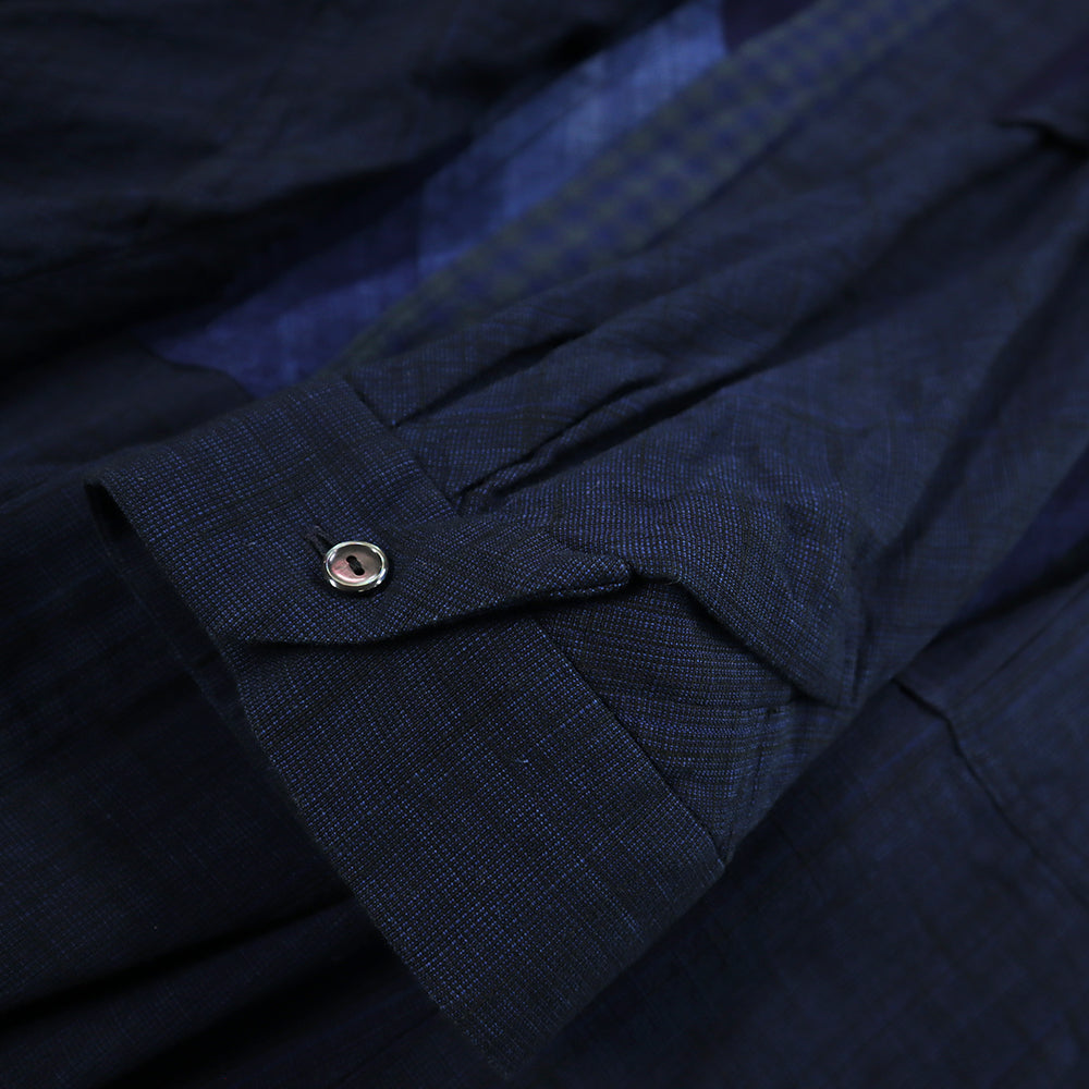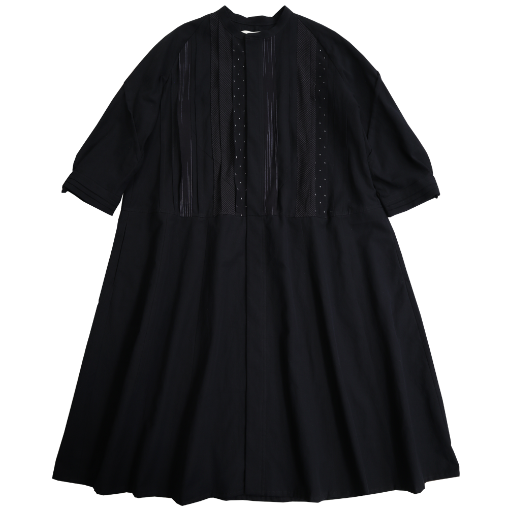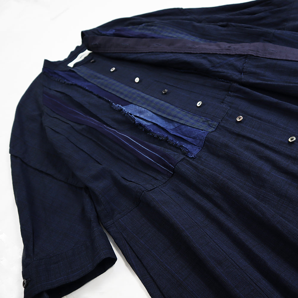 4柄の素材を組み合わせ、丁寧にパッチワークで仕立てた技法ワンピース。帯や太・細ピンタック、裁ち切り仕様など、手の込んだディテールを随所に取り入れ、奥行きのある表情に仕上げました。