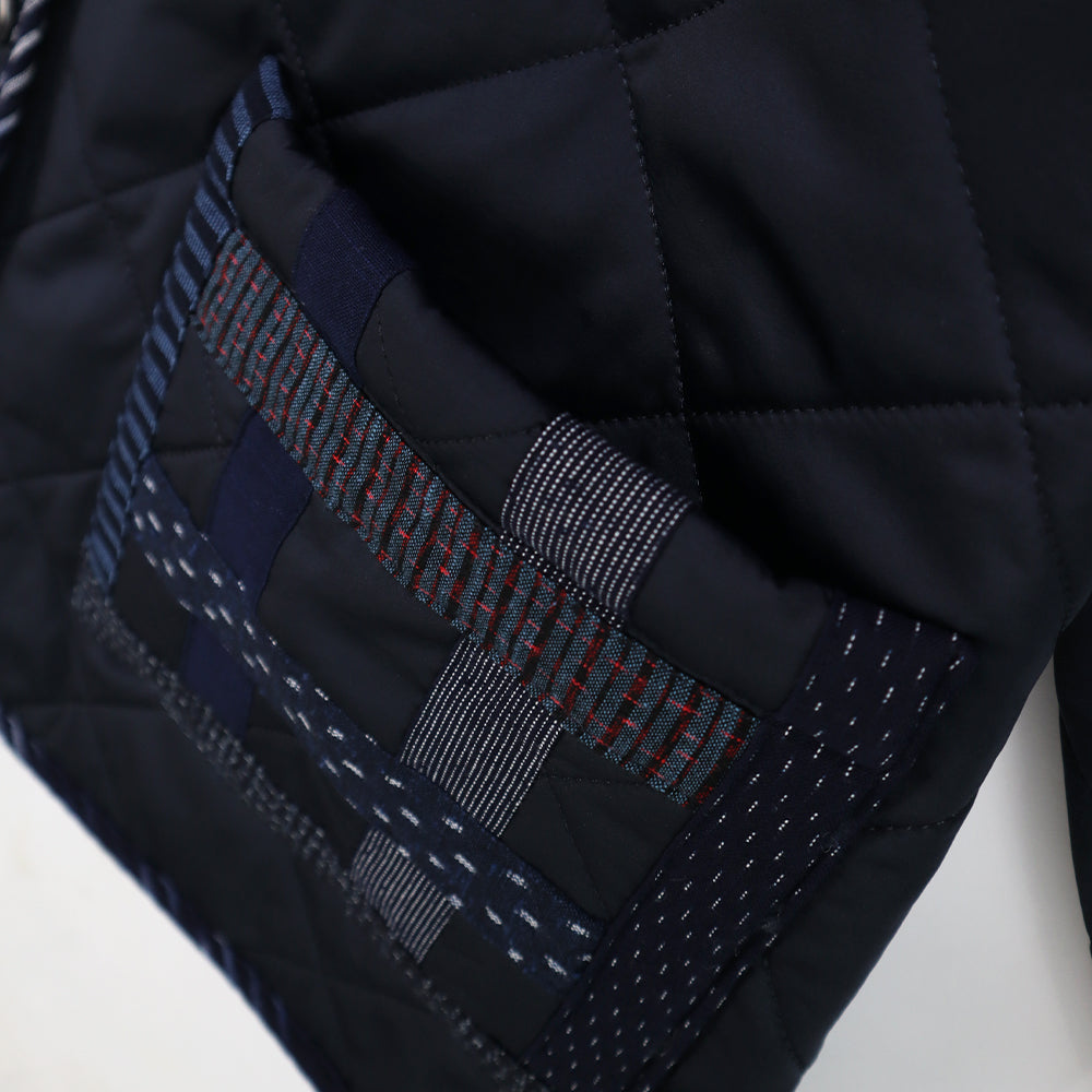 ポケットと身頃のパイピング部分には、9種類の絣素材を贅沢に使用。ひとつひとつ表情の異なる絣がさりげないアクセントとなり、シンプルなデザインの中に温もりと個性をプラスしています。
