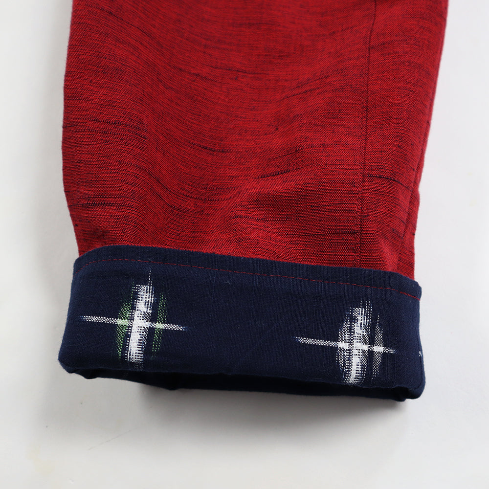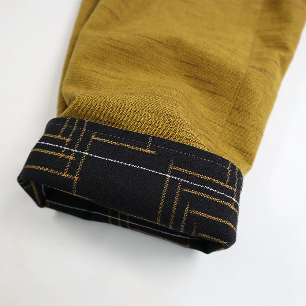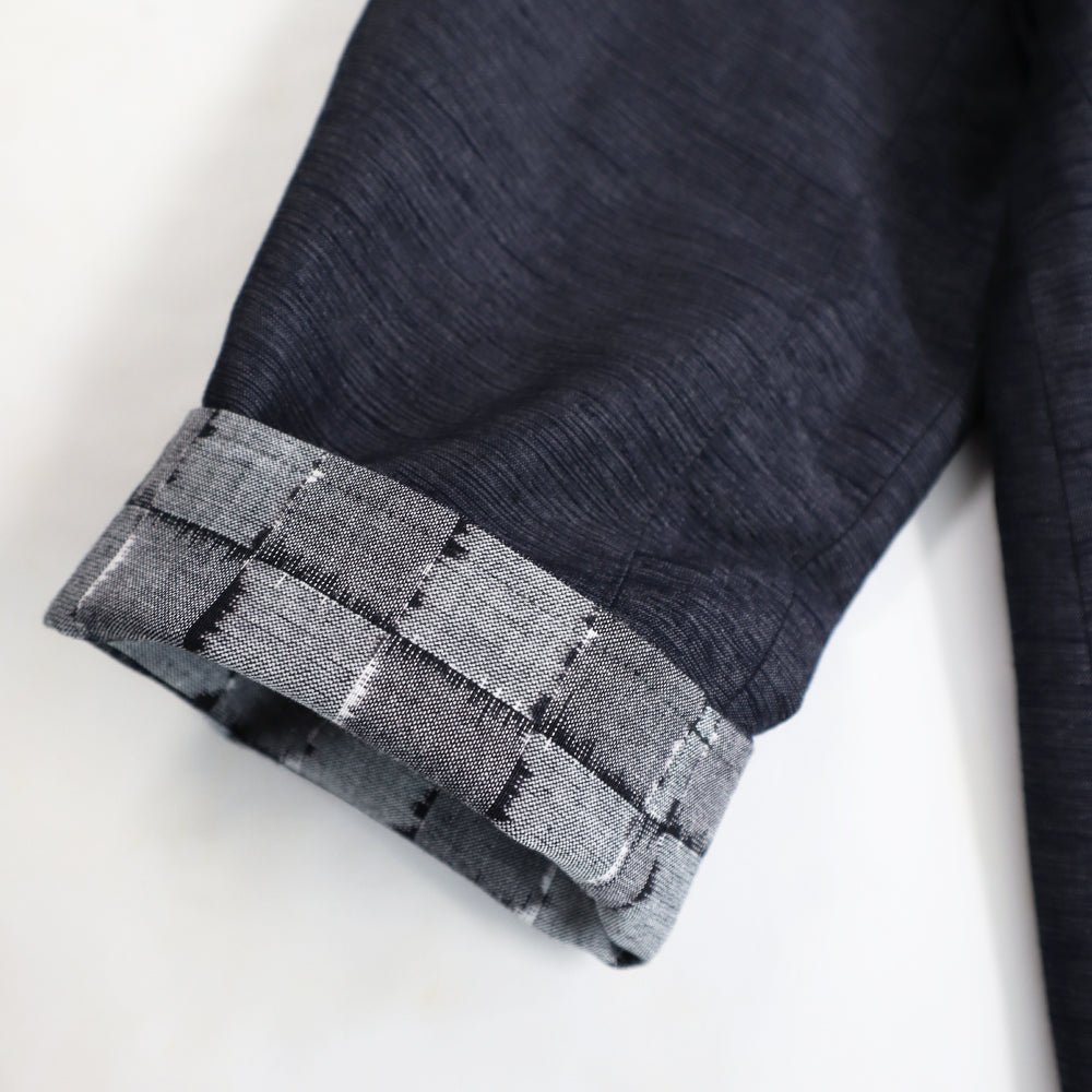 さらに、衿ぐりや袖口の見返し部分にはさりげなく柄生地をあしらい、シンプルな中にも遊び心のあるアクセントをプラス。動いたときにちらりと見える柄がおしゃれ度をぐっと高めてくれます。