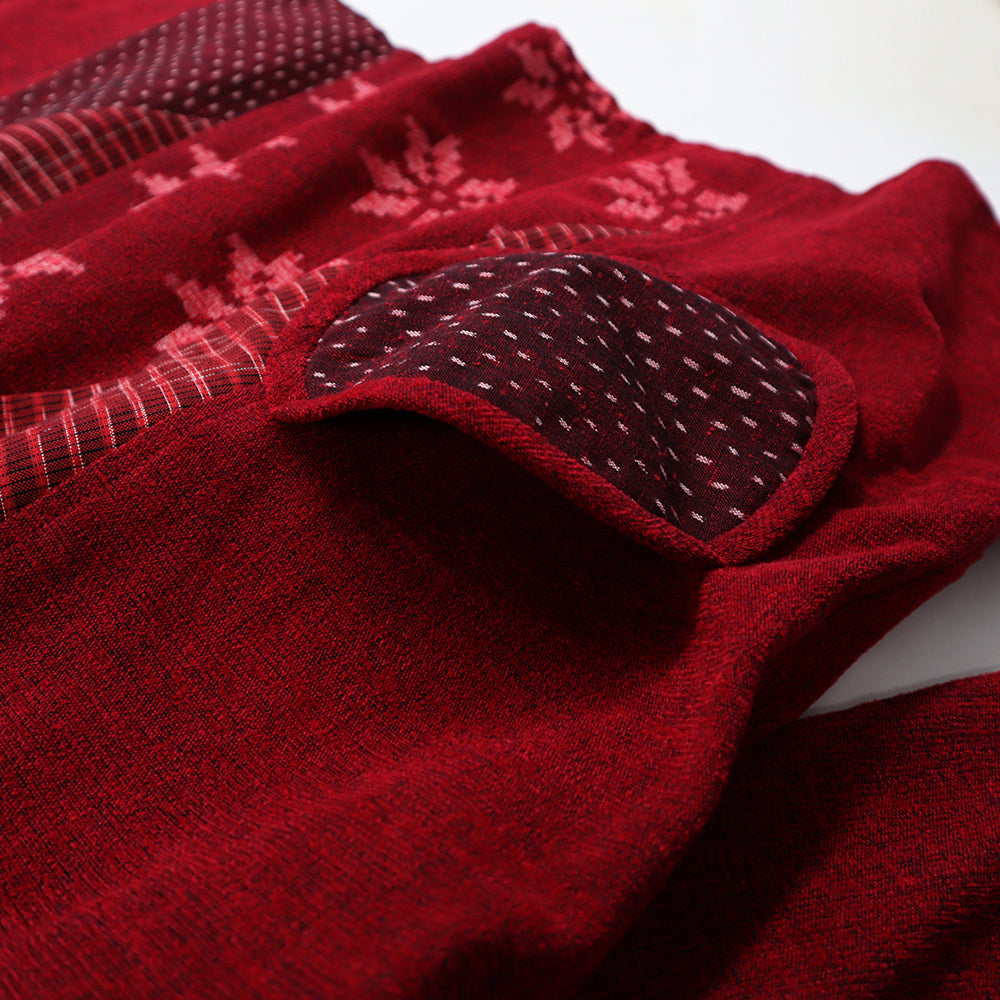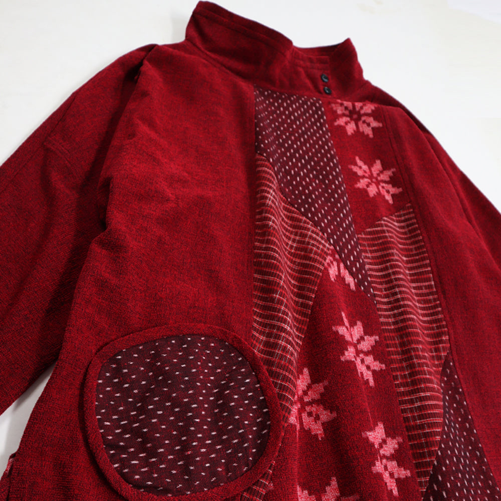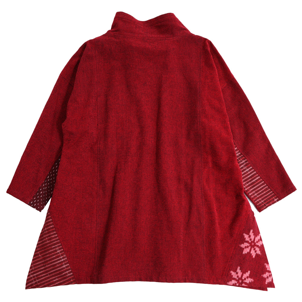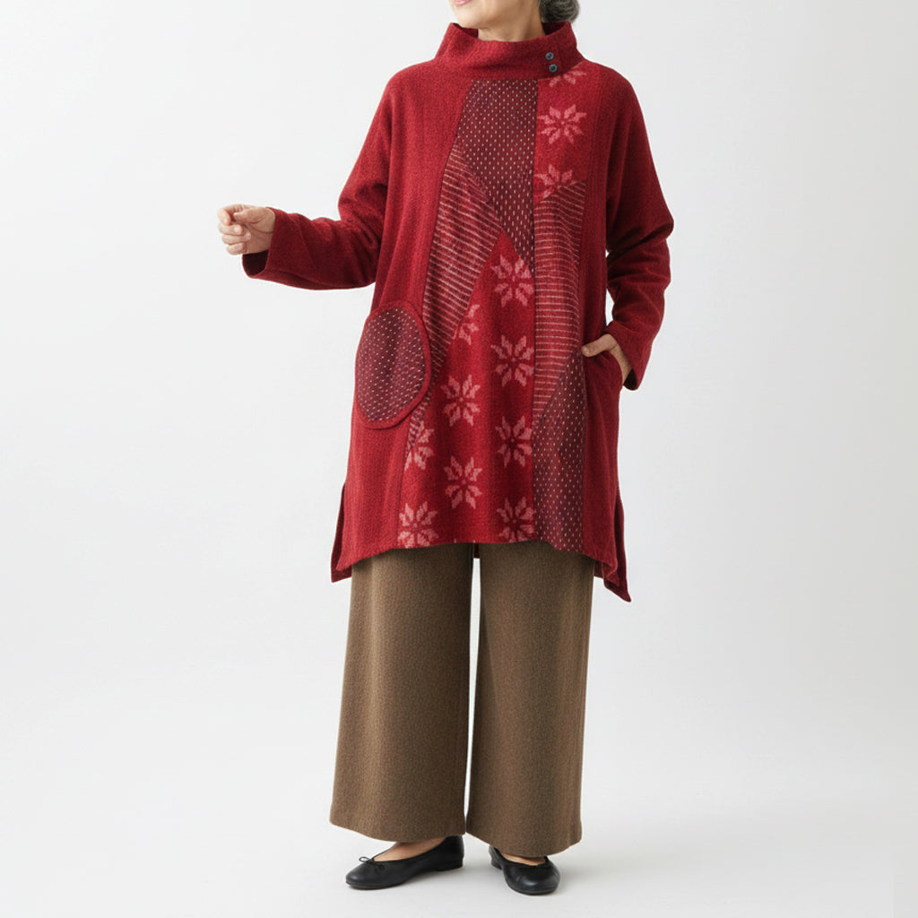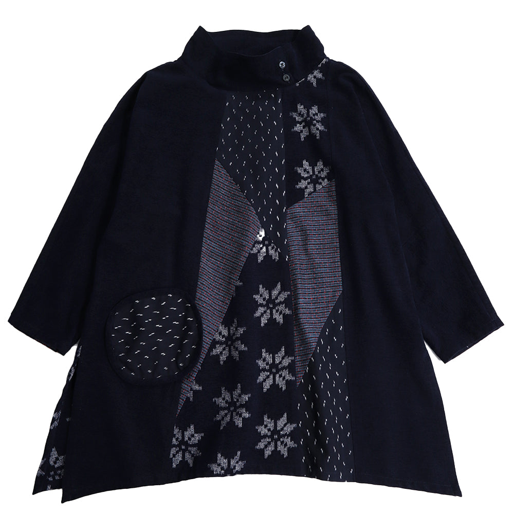 ゆったりとしたラインが魅力のドルマンタイプのプルオーバー。前身頃にはパッチワークデザインを施し、シンプルながら個性が光る一着に仕上げています。衿元はやわらかく立ち上がるスタンドカラーで、カジュアルさの中に上品さをプラス。