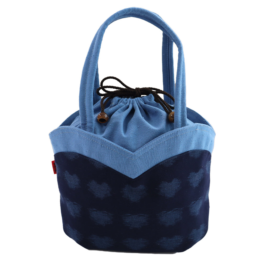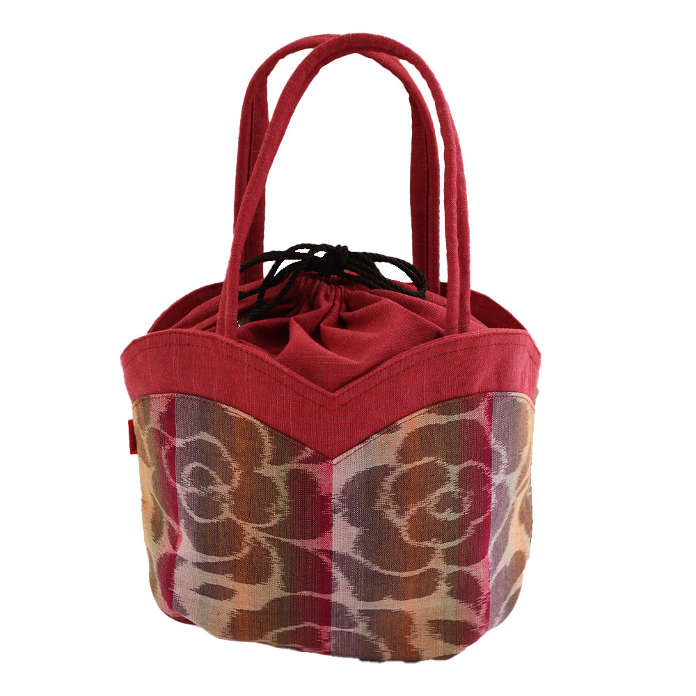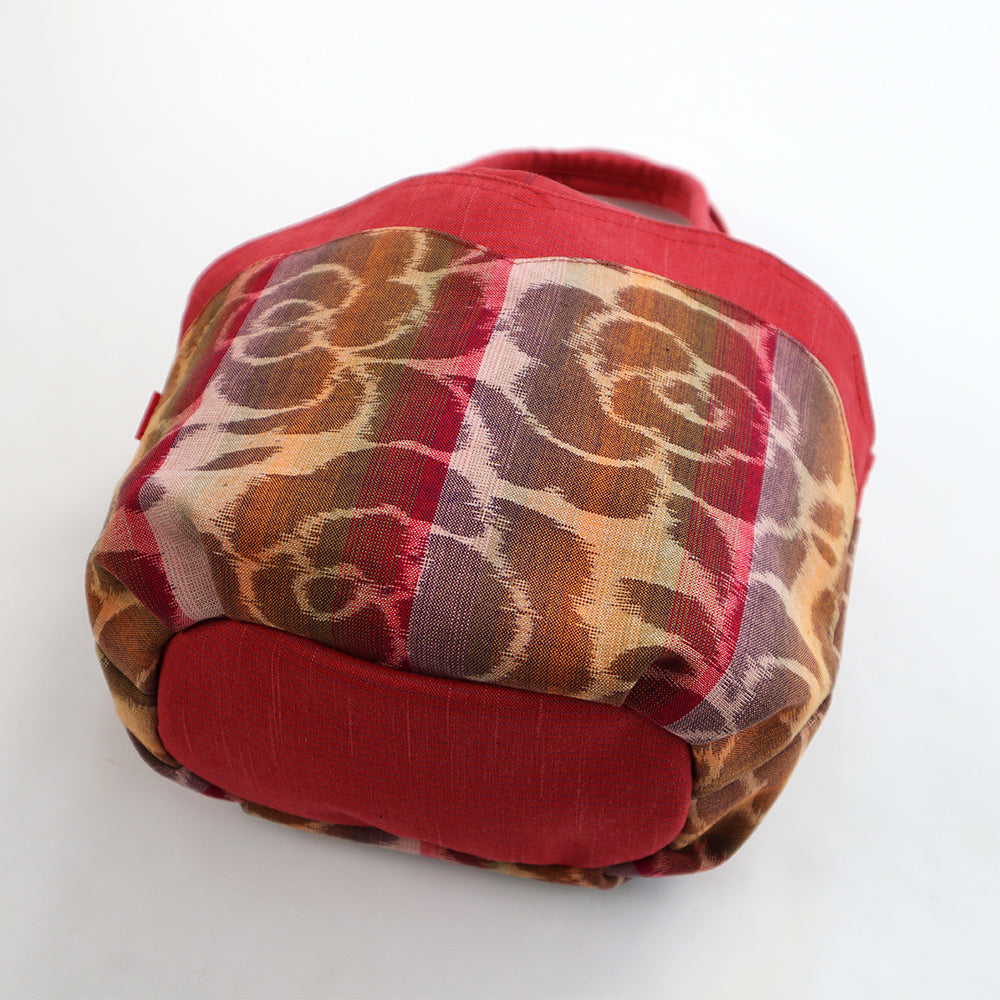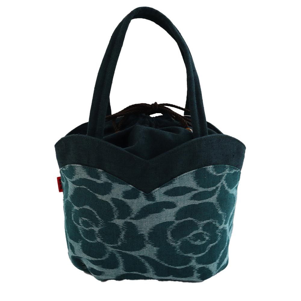 本体上部のチューリップのようなカーブラインを更に強調するように配色をしたデザイン。ふんわりした形を出す為に、底部分にタックをいれ、丸く優しくなるようにしました。覆い布を絞ったり、覆い布をおろしたり、使い方は自由にできるカゴのようなタイプ。本体上部のダブルステッチもデザインポイントです。中袋にパッチポケット有り。