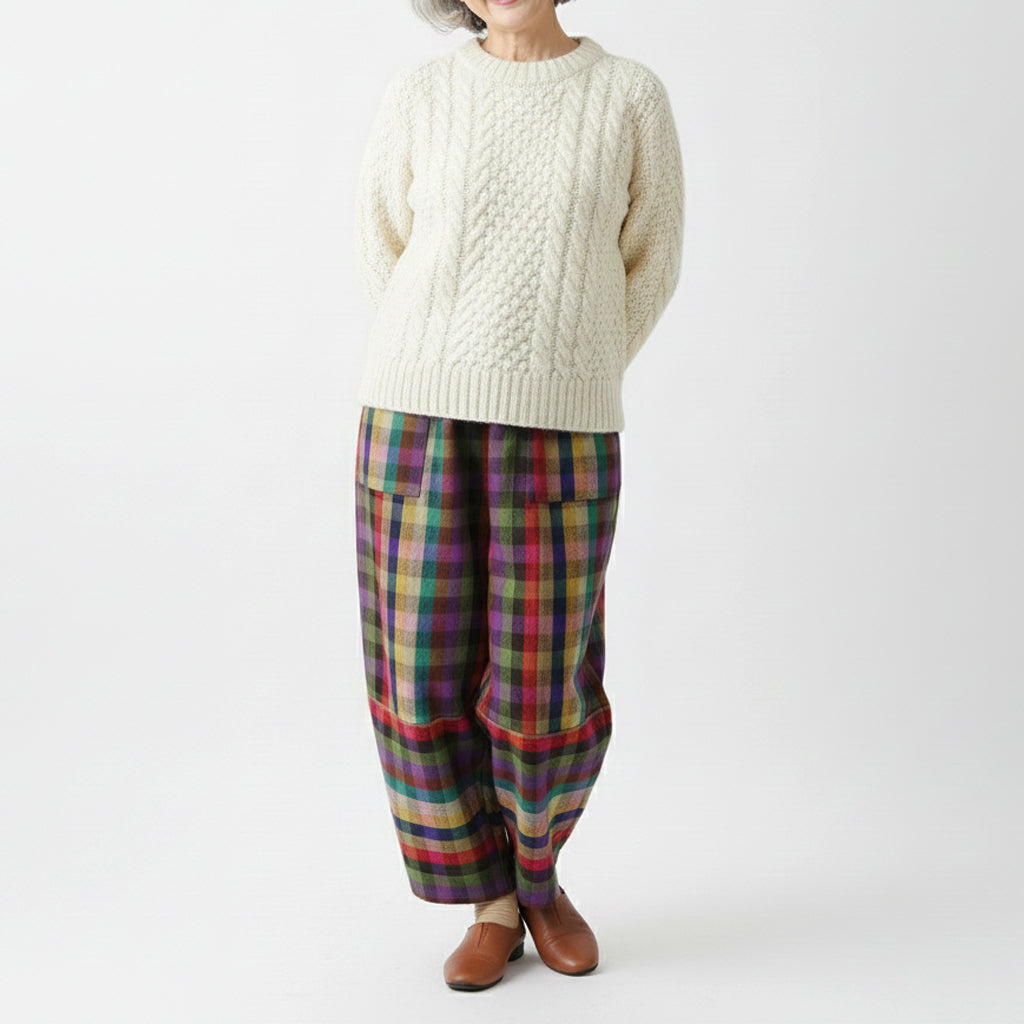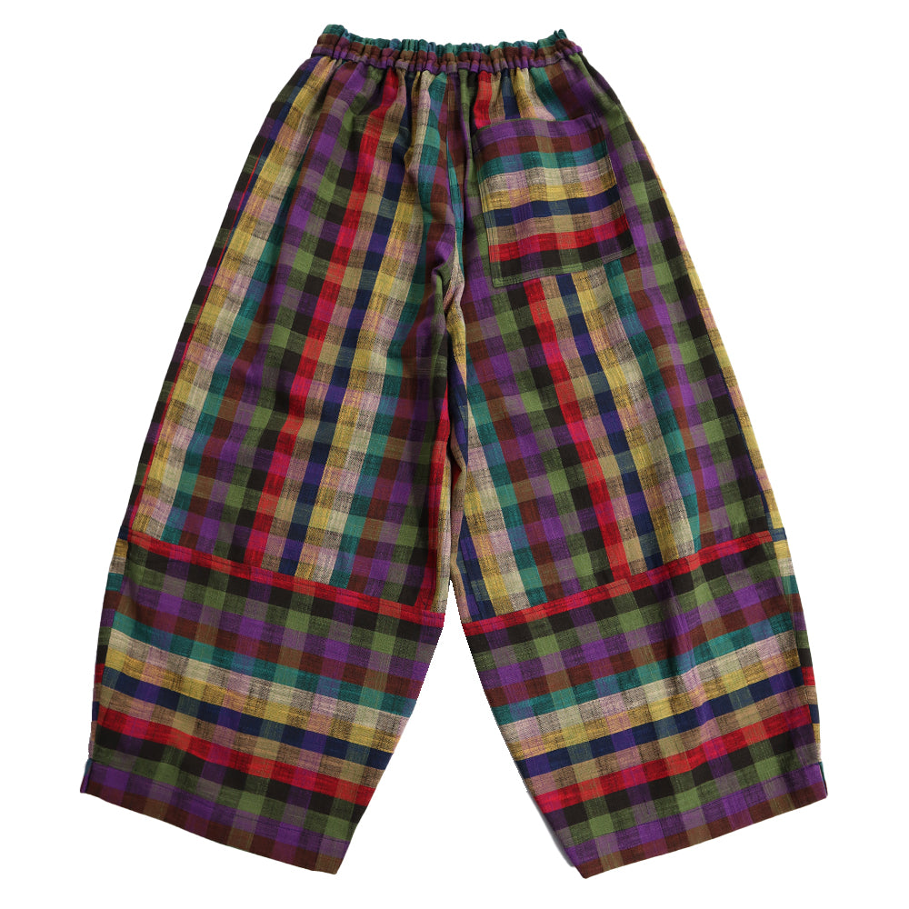 丸みのあるフォルムが特徴的なサーカスパンツです。裾に切替えを入れたデザインがさりげないアクセントとなり、シンプルながらも表情のある仕上がりに。全体的にゆったりとしたシルエットで、身体のラインを拾いにくく、リラックスした履き心地が魅力です。