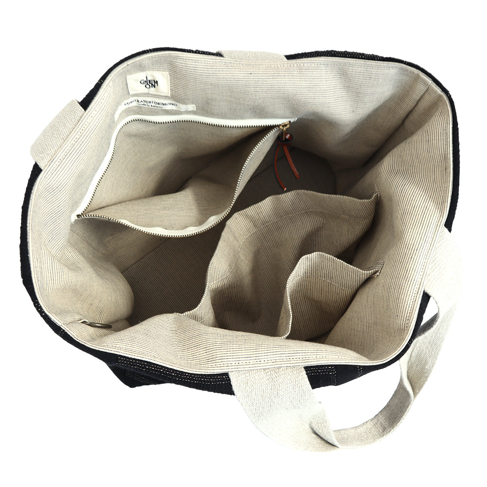 內袋有拉鍊口袋,一大一小開放口袋,提把採用亞麻膠帶,厚實、耐用、柔軟。