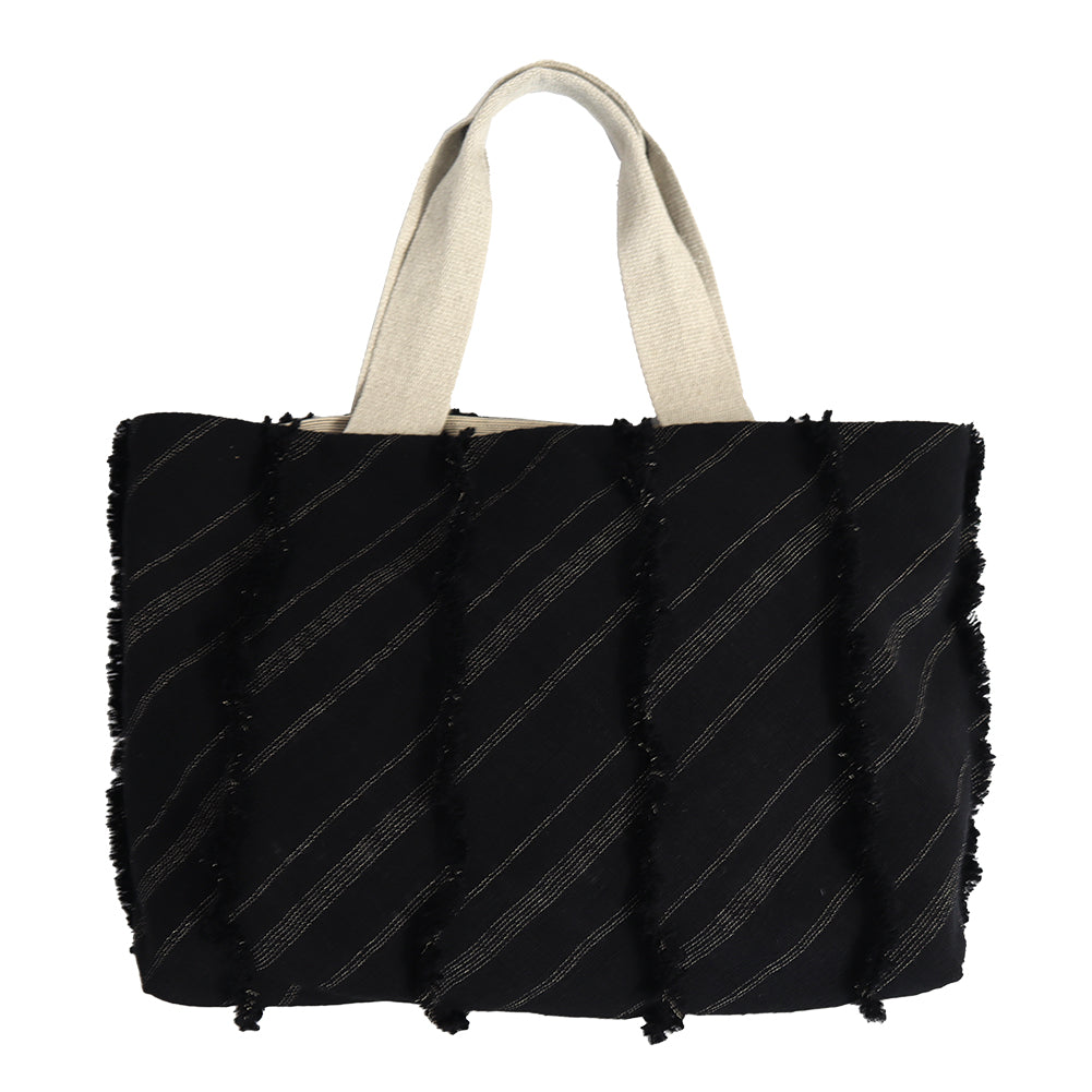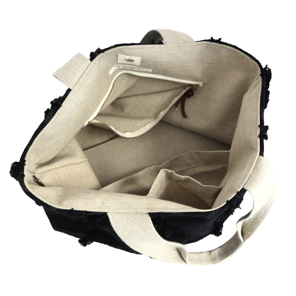 內袋有拉鍊口袋(附牛皮吊飾),一大一小開放式口袋,提把採用亞麻膠帶,厚實耐用,觸感柔軟,握在手中舒適。