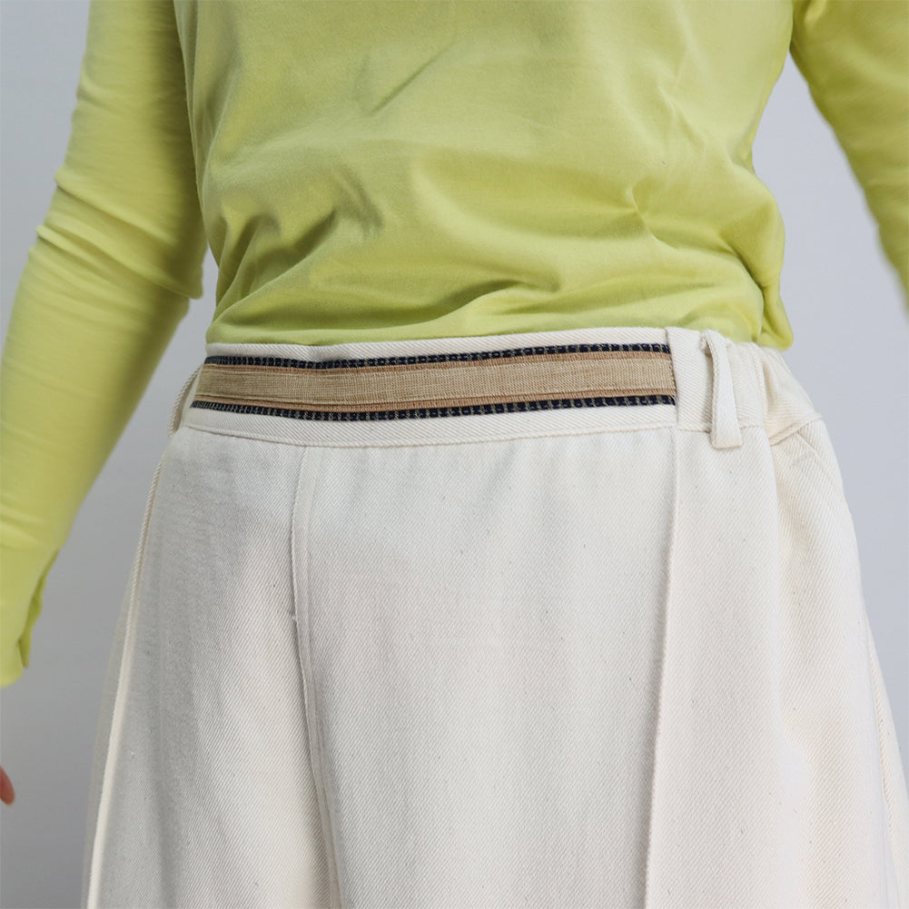 寬直的廓形,前褲中央有2毫米的細褶,即使搭配休閒褲也很漂亮。前面的腰帶是一個設計點,布料重疊,就像配件一樣。大後袋有 J Tyrol 貼袋。