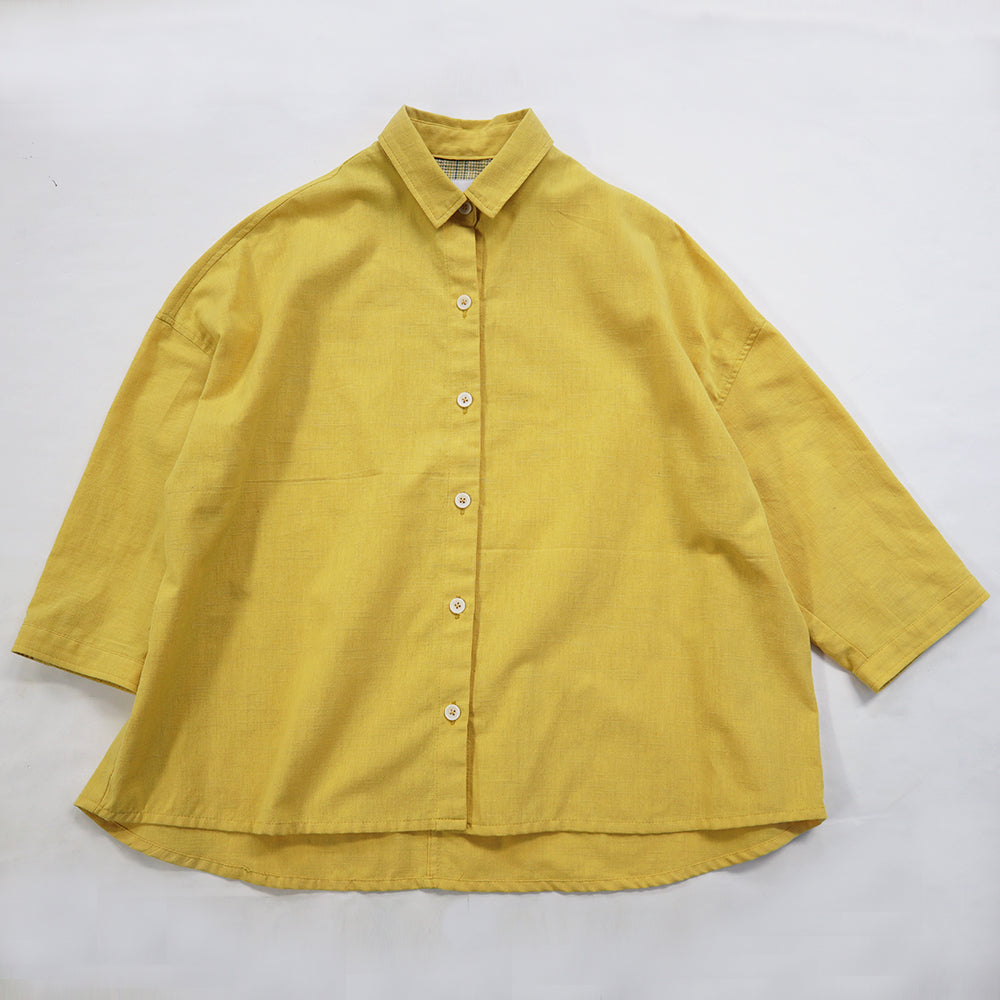 ギエモン定番シャツカラーブラウス。ゆったりとした身巾に短めの着丈のブラウスです。パンツやスカートに合わせやすく、羽織としても使えるアイテムです。