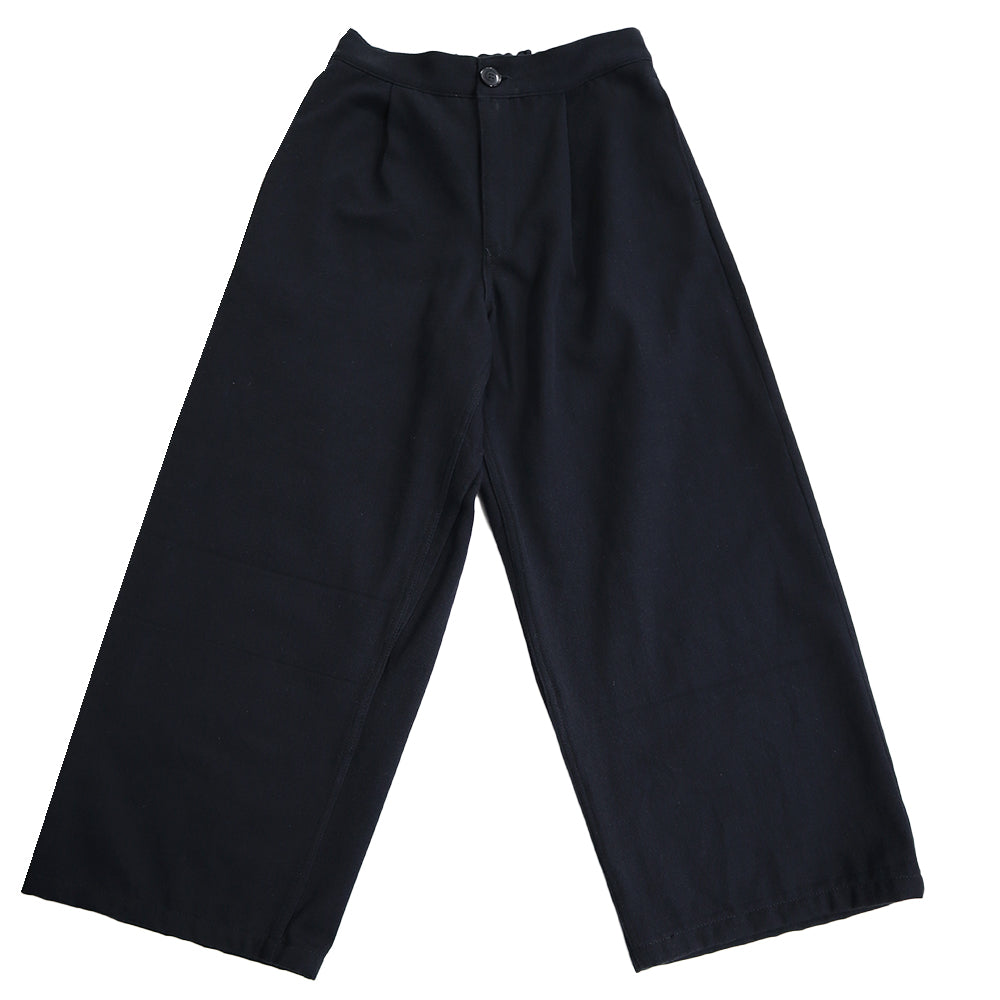 前ファスナー明きのワイドストレートPT。前身はベルト仕立て、後身はゴム仕様で履き心地の良いパンツになっています。