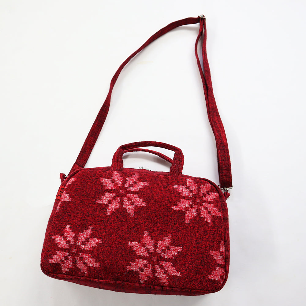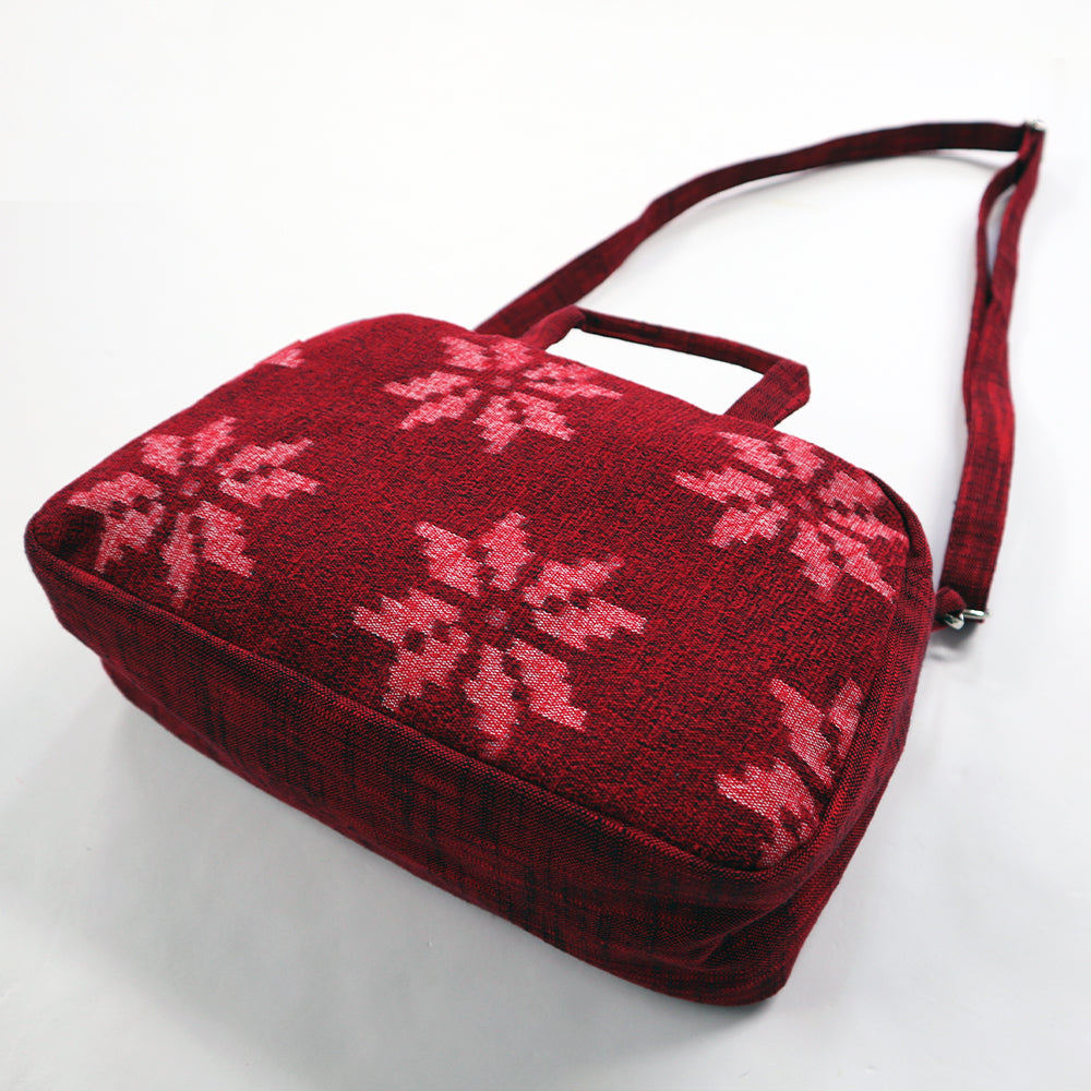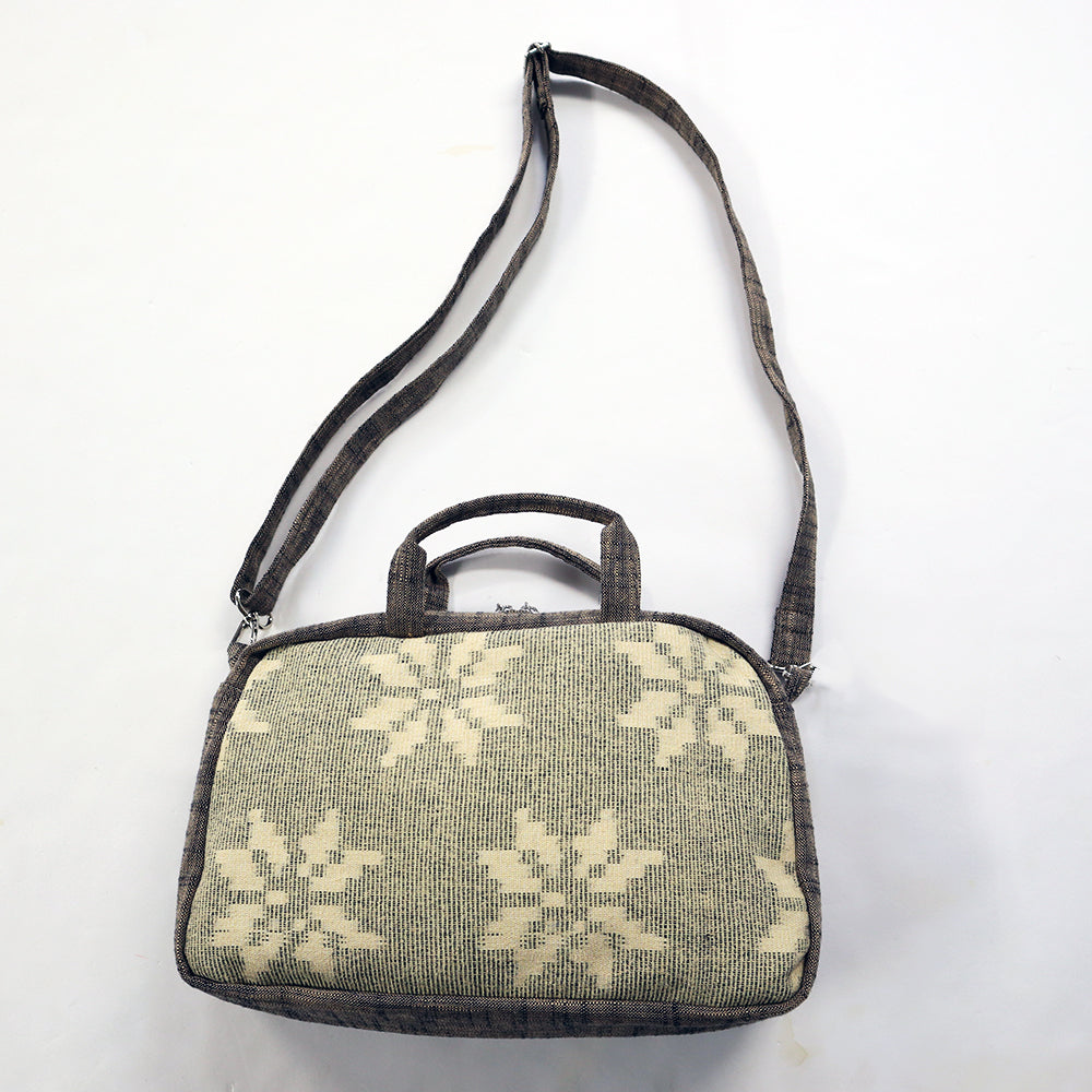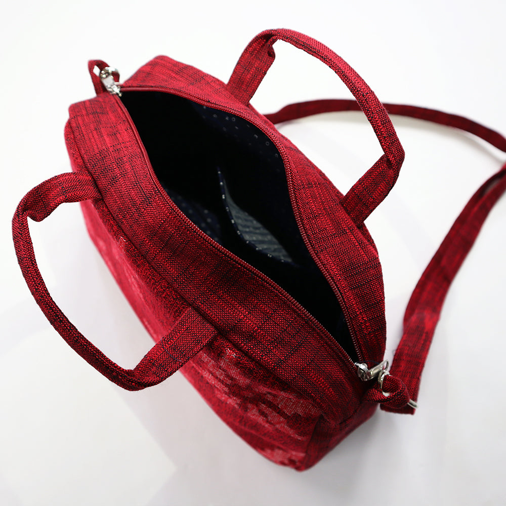 緯糸にモール糸を使用しているので通常の久留米絣の素材よりも温かみのある質感です。形は、ミニミニボストンタイプでマチもしっかりあり、両開きのファスナー、中袋にポケット2つという機能性もバッチリなポシェットです。ヒモは取り外し可能なので、ポーチとしても使える便利品です。