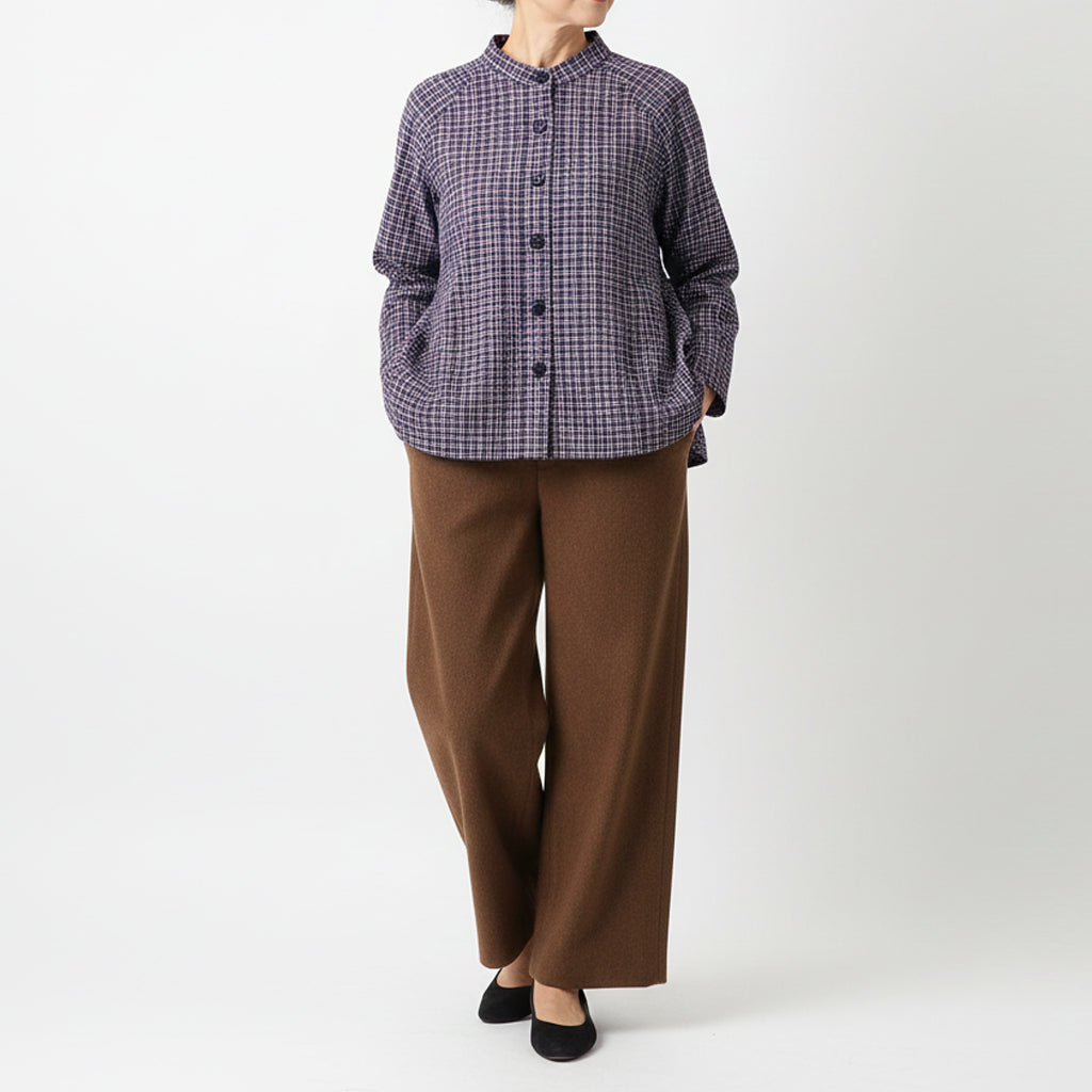 裏ガーゼ付きで肌あたりが柔らかく、着心地の良さにこだわったノーカラー前開きブラウスです。軽い羽織としても使えるデザインで、季節の変わり目にも活躍する一枚。